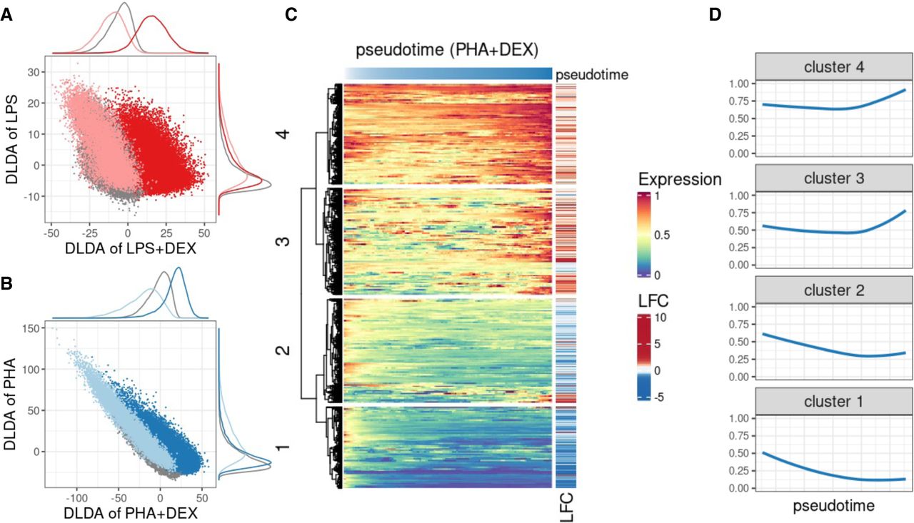 Characterization of dynamic changes along immune response pseudotime. (A) Scatterplot of the DLDA pseudotime for LPS + DEX (x-axis) and the DLDA pseudotime for LPS (y-axis) in T cells. Each dot represents a cell, with the color indicating the treatment condition: gray for unstimulated, pink for LPS, and red for LPS + DEX. (B) Scatterplot of the DLDA pseudotime for PHA + DEX (x-axis) and the DLDA pseudotime for PHA in T cells. Each dot represents a cell, with the color indicating the treatment condition: gray for unstimulated, light blue for PHA, and dark blue for PHA + DEX. (C) Heatmap of relative gene expression for 1617 DEGs (rows) averaged over windows containing 10% of T cells (columns) sliding at a step of 0.1% of T cells along the PHA + DEX response pseudotime. For each gene, gene expression is expressed relative to the highest expression across pseudotime. Red color denotes high expression value, yellow denotes medium expression value, and blue denotes low expression value. The LFC column on the right indicates the LFCs for each DEG between PHA and PHA + DEX. (D) Dynamic patterns of relative gene expression averaged across all genes within each cluster using the same sliding window approach as in C.