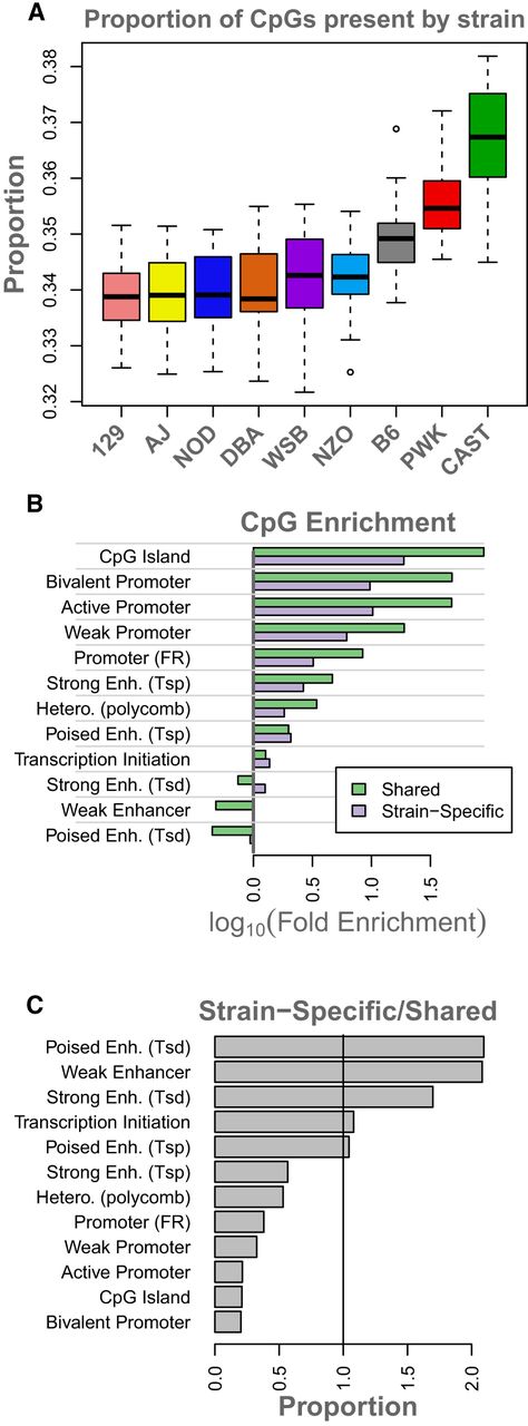 Overview of strain-specific CpG sites. (A) Boxes show the proportion of strain-specific CpG sites that is present in each strain. Boxes are colored by official strain colors for ease of visualization. Short names for strains are indicated below each box. (B) The log10 (fold enrichment) of CpG sites shared across all strains (green) and those that are strain specific (purple). (C) A comparison of enrichments between CpG sites that are shared across all strains and those that are strain specific. Bars above one show where strain-specific CpGs were more enriched than shared CpGs. Bars below one indicate where strain-specific CpGs were less enriched than shared CpGs. The vertical line marks where shared and strain-specific CpGs were equally enriched. Abbreviations are as follows: (FR) flanking region, (Tsp) transcription start site proximal, (Tsd) transcription start site distal, (Hetero.) heterochromatin, (Enh.) enhancer.