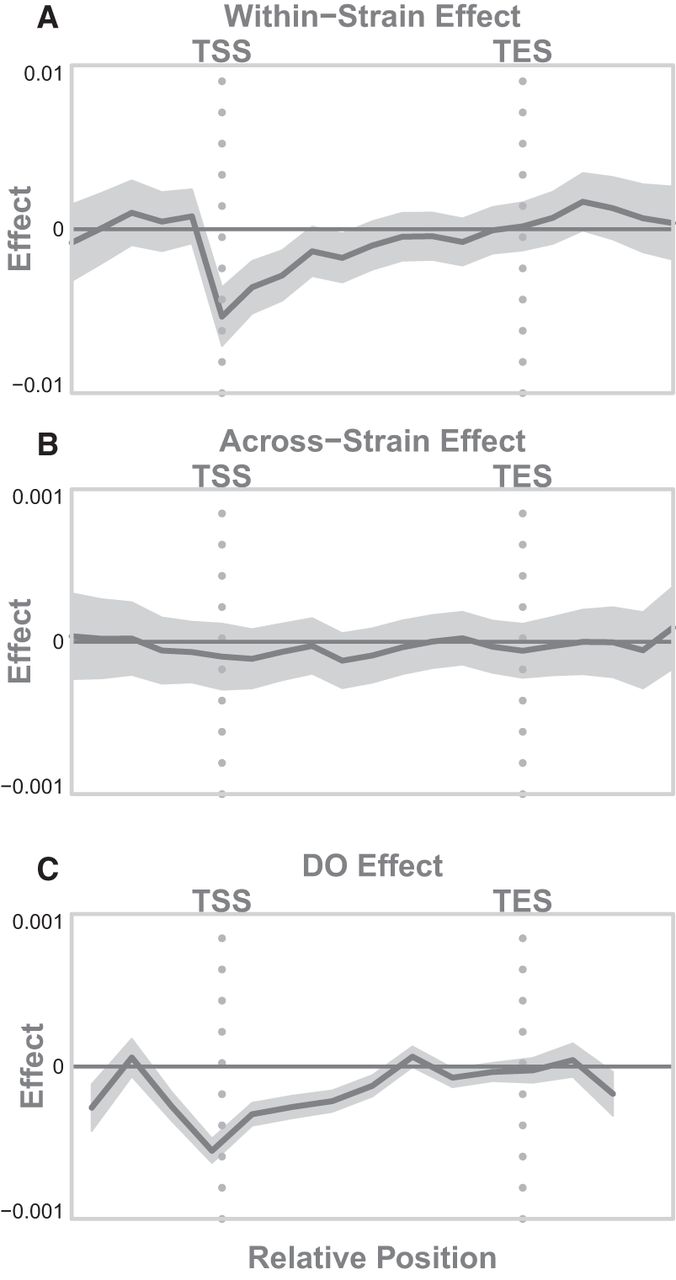 Association of DNA methylation with gene expression (A) across genes in hepatocytes, (B) across inbred strains, and (C) in the DO population. The dark gray line shows the estimated effect of percentage of DNA methylation on gene expression. The x-axis is normalized position along the gene body running from the TSS to the TES, marked with vertical gray dotted lines. The horizontal solid black line indicates an association of zero. The shaded gray area shows a 95% confidence interval around the model fit.