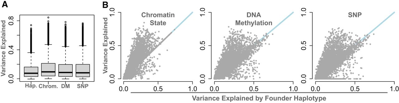 Comparison of the variance explained in DO gene expression by four genomic features: haplotype (Hap.), chromatin state (Chrom.), local SNP genotype (SNP), and local imputed DNA methylation status (DM). (A) Distributions of gene expression variance explained by each feature. (B) Direct comparisons of variance explained by local haplotype and each of the other genomic features. Blue lines show y = x. Each point is a single transcript.