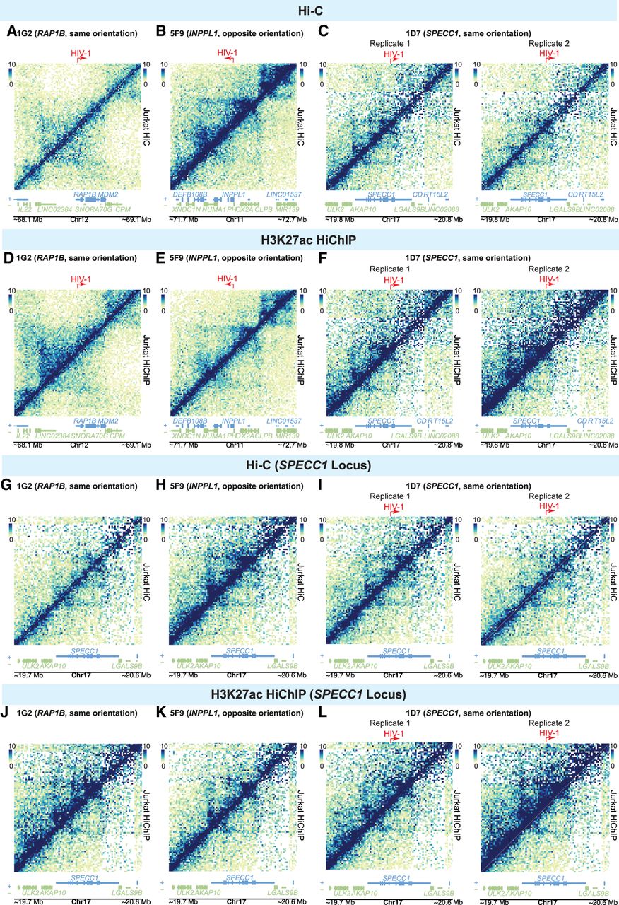 Impact of HIV-1 on genome-wide 3D chromatin conformation and H3K27ac enhancer loops at the integration site. Heatmap shows Knight–Ruiz (KR) normalized signal at 10-kb resolution surrounding their respective integration sites in Hi-C (A–C) and H3K27ac HiChIP (D–F). Heatmaps showing the Hi-C (G–I) and interaction (J–L) profiles at the same genomic window in lines with no HIV-1 integration into SPECC1 (G,H,J,K) and those with HIV-1 integrated into SPECC1 (I,L).