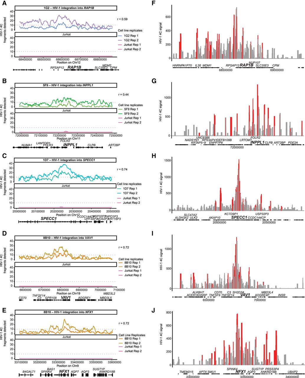HIV-1–host chromatin interactions captured by HIV-1 4C-seq. (A–E) Genomic tracks of the number of fragments detected (captured with at least 10 reads) in a running 40-fragment window, which was slid five fragments at a time. Shown is a 500-kb window centered on the integration site. Signals in Jurkat 4C-seq libraries were shown for comparison. Pearson correlation coefficient between experimental replicates is indicated. Dotted line indicates 10 fragments, the threshold chosen for overlapping with ATAC-seq peaks. (F–J) Genomic tracks of the read normalized signal as calculated by peakC in a 21-fragment sliding window in a 1-Mb region centered on the integration site. Red regions indicate P < 0.05 relative to distance-based model.