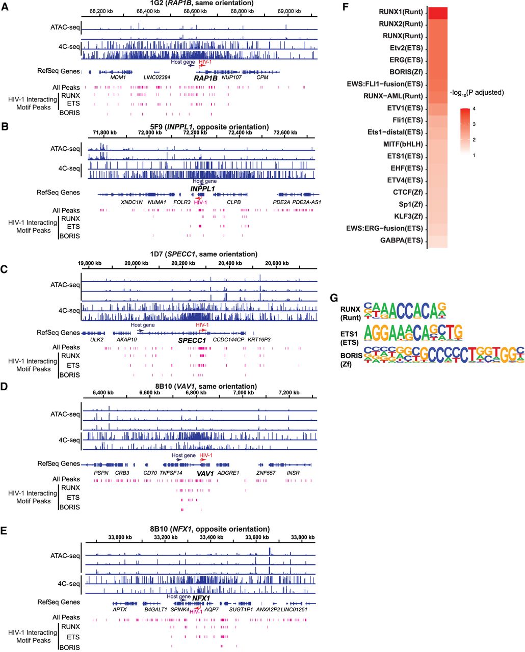 Transcription factor binding motifs enriched in both increased chromatin accessibility and HIV-1–host chromatin interactions. (A–E) HIV-1 interacting peaks, defined as regions of overlapping ATAC-seq peaks and 4C-seq signal (fragments detected were 10 or more in at least one replicate out of 40 possible), were extracted from the integrated chromosome in each cell line. (F) Transcription factor binding motifs that were enriched in HIV-1 interacting peaks were identified by HOMER. Top 20 known motifs ranked by adjusted P-values. (G) Example motif logos for each of the top three transcription factor groups: ETS, RUNX, and ZNF. P-values were corrected for multiple hypothesis testing by the Benjamini–Hochberg procedure.