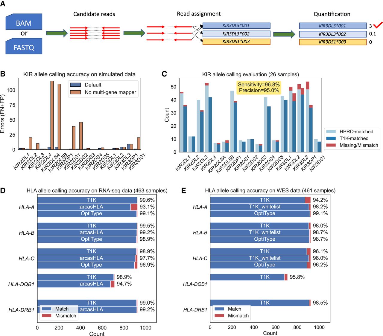 Evaluation of T1K. (A) Overview of the T1K workflow. (B) The KIR allele prediction accuracy of T1K and T1K with no multiple-gene mapped reads (mimicking arcasHLA) on simulated reads from KIR mRNAs. (FN) False negative; (FP) false positive. (C) The KIR allele prediction accuracy of T1K on WGS. (HPRC matched) The alleles inferred from the HPRC phased genome that can be found in T1K predictions; (T1K matched) the alleles predicted by T1K that can be found on HPRC genomes. (D) The HLA allele prediction accuracy of T1K, arcasHLA, and OptiType on RNA-seq data validated with 1kPG annotation. (E) The HLA allele prediction accuracy of T1K and OptiType on WES data validated with 1kPG annotation. With T1K_whitelist, T1K only reports alleles present in an allele whitelist coded in OptiType's Python script.