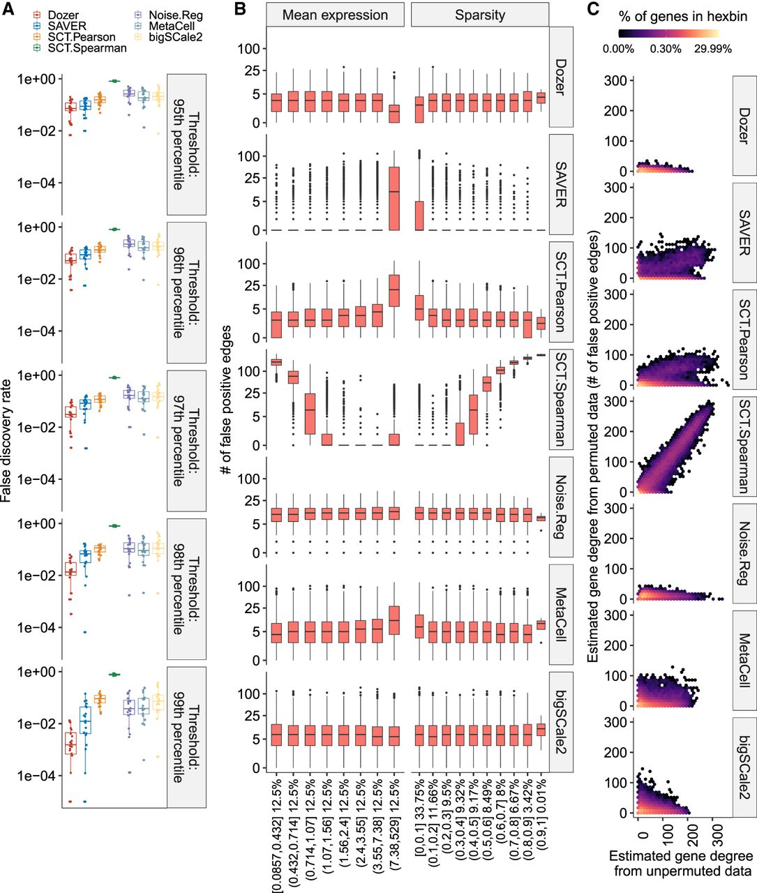 Impact of the overall expression and sparsity levels of genes on false-discovery rates of coexpression network edge detection. (A) Empirical false-discovery rates of the methods across multiple permutation experiments with the Jerber_2021 samples at multiple distinct thresholds set by the percentiles of the absolute values of the estimated correlations. The P-values from a one-sided Wilcoxon rank-sum test between Dozer and the second-best method, SAVER, for the five quantile thresholds are 0.077, 0.0014, 4.1 × 10−5, 9.5 × 10−6, and 0.00016, respectively. (B) Numbers of false-positive edges of genes stratified by mean expression levels and the proportion of zeros in gene counts (sparsity). Percentages on the x-axis denote the percentage of genes in the expression and sparsity intervals. (C) Estimated gene degrees (i.e., numbers of edges connected to a gene) from the coexpression network with the permuted (y-axis) versus unpermuted (x-axis) data. Coexpression networks are constructed between the two groups of genes that result from splitting of the genes. Gene degrees are estimated from coexpression networks with the original data (unpermuted; x-axis) and data in which cells are permuted for one set of the genes (permuted; y-axis). Because the correlation of genes in the permuted data is zero, the corresponding gene degrees are contributed by falsely detected edges, highlighting the aggregated impact of mean expression levels and proportion of zeros in deriving the genes’ overall associations. Results are pooled from multiple permutation replicates across the genes.