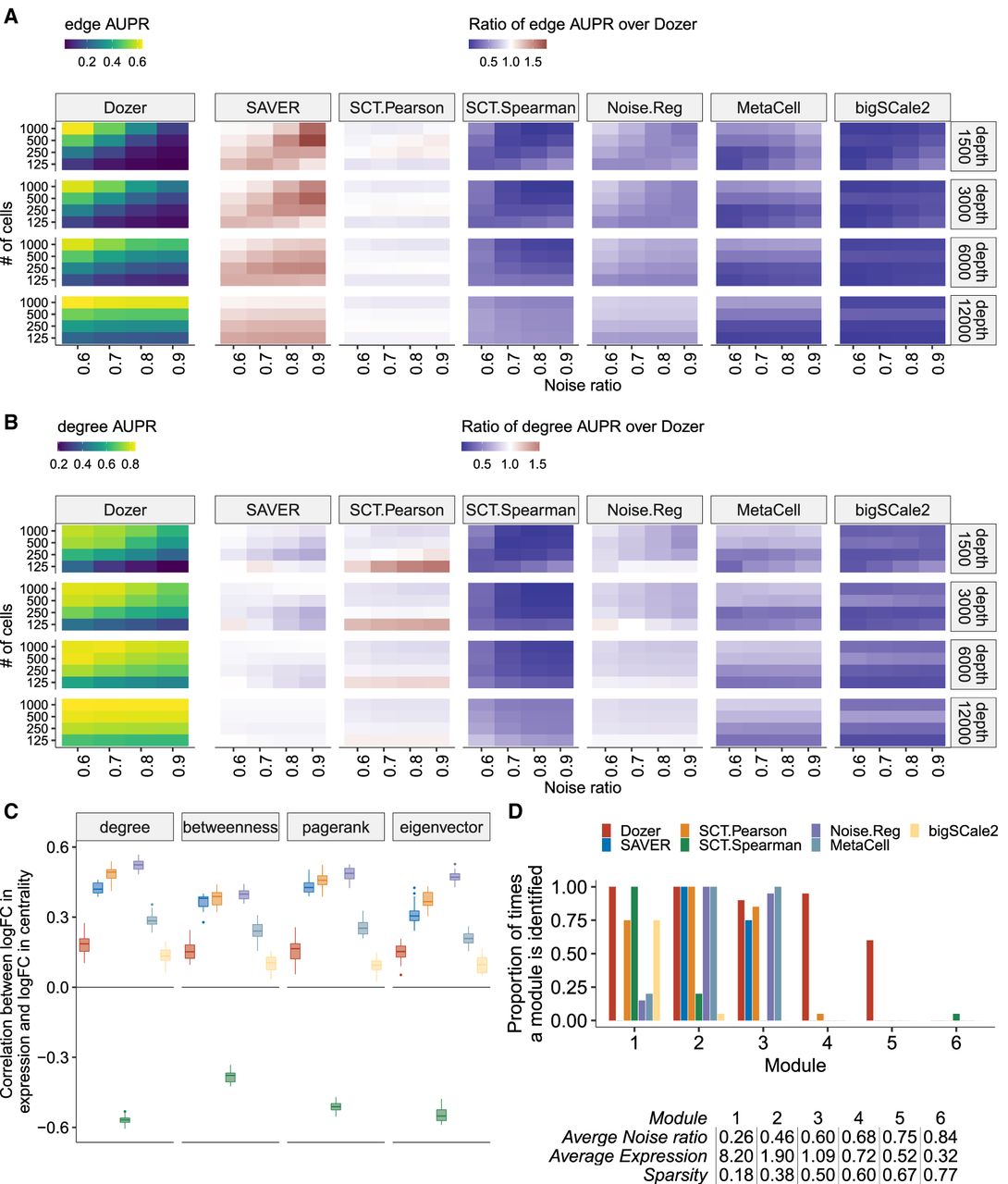 Evaluation for gene centrality and module estimation. (A,B) Summary of simulation results in terms of AUPR scores for edge and high degree centrality gene identification. The leftmost panel depicts the average AUPR scores of Dozer for edge (A) and degree (B) centrality identification as a function of gene noise ratios (x-axis), number of cells (y-axis), and average sequencing depths (rows). The remaining panels highlight the performances of other methods as quantified by the ratio of their AUPR scores over the AUPR score of Dozer. Results for the identification of high centrality genes with respect to pagerank, betweenness, and eigenvector centrality are in Supplemental Figure S7. (C) Robustness of estimated gene centrality measures against differential expression. Box plots of Spearman's correlations between log2 fold changes (logFCs) of expression and centrality across genes are displayed for individual methods. Although the two batches of simulated data sets have induced differential expression, they share the same coexpression network structure, leading to differential expression but similar centrality measures of the genes across the two batches. (D) Proportion of times each module is identified by each method. A gene module was deemed as identified by a method if it has a Jaccard index overlap of at least 0.5 with WGCNA estimated modules of the method. The table below the bar plot provides the average sparsity, expression, and noise ratio of genes in each module.
