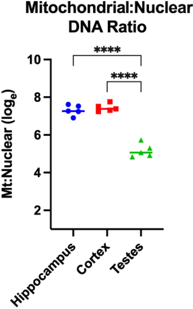 Mitochondrial-to-nuclear (mt:nuc) DNA. The mitochondrial-to-nuclear ratio is significantly reduced in mouse testes. (****) P < 0.0001.