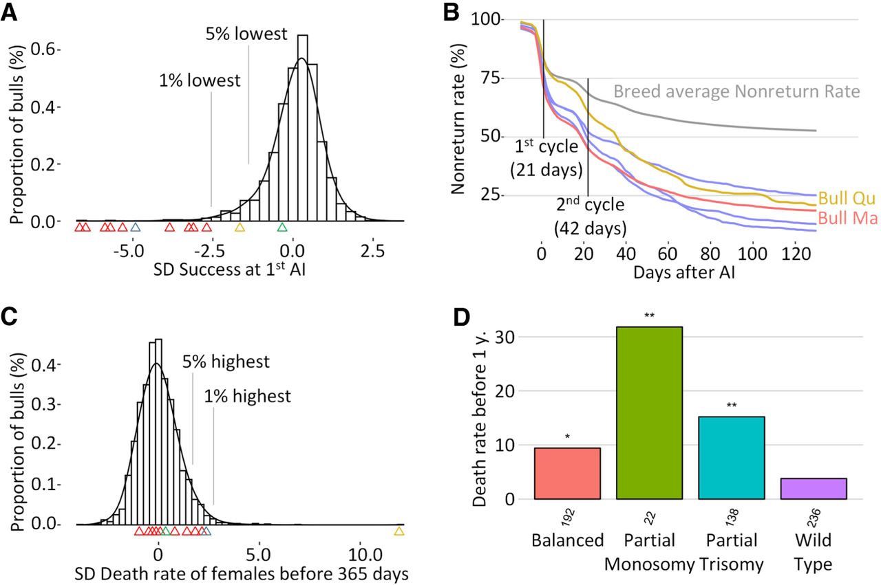 Analysis of conception rate, nonreturn rate (NRR), and juvenile mortality. (A) Conception rate of first artificial inseminations (1st AI) of 2900 bulls with nulliparous females, conventional semen, expressed as SD from the mean to allow comparison between bulls from different breeds. Arrowheads indicate carriers of the following IRs: red for reciprocal translocations, yellow for insertional translocation, gray for reciprocal with derivative loss, and green for Robertsonian translocation. (B) NRR for five affected Holstein bulls (i.e., the proportion of females that were not reinseminated after an insemination with the semen of the bull in question) and mean NRR of 2152 Holstein bulls. Two extreme bulls, Qu and Ma, are highlighted in red and yellow. (C) Mortality rates over the first year of life among the daughters of 2854 bulls considered, expressed as the SD from the mean of their respective breeds (same color code as in vignette A). (D) Distribution of mortality rates at 1 yr of age for Nt's progeny (n below bars). (*) Fisher comparison with wild-type group P < 0.05, (**) P < 0.01.