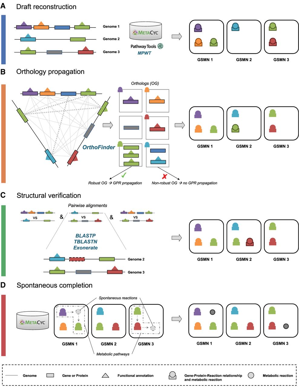 Reconstruction and homogenization of metabolisms with AuCoMe. Starting from a data set of partially structurally and functionally annotated genomes, AuCoMe's pipeline performs the following four steps. (A) Draft reconstruction. The reconstruction of draft genome-scale metabolic networks (GSMNs) is performed using Pathway Tools in a parallel implementation. (B) Orthology propagation. OrthoFinder predicts orthologs by aligning protein sequences of all genomes. The robustness of orthology relationships is evaluated (see Methods), and gene–protein–reaction (GPR) of robust orthologs are propagated. (C) Structural verification. The absence of a GPR in genomes is verified through pairwise alignments of the GPR-associated sequence to all genomes where it is missing. If the GPR-associated sequence is identified in other genomes, the gene is annotated, and the GPR is propagated. (D) Spontaneous completion. Missing spontaneous reactions enabling the completion of metabolic pathways are added to the GSMNs. (OG) Orthologs. Outlines around GPR or reaction indicate that the GPR or reaction is newly added during the corresponding step.