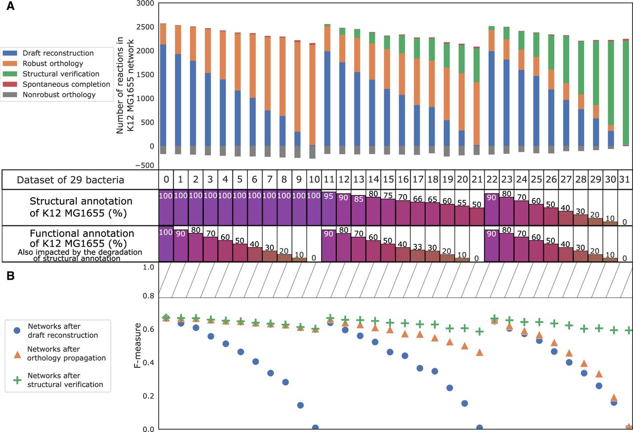 Efficiency of AuCoMe on degraded genome assemblies. (A) Number of reactions in E. coli K–12 MG1655 degraded networks after application of AuCoMe to 32 synthetic bacterial data sets. Each data set consists of the genome of E. coli K–12 MG1655, to which degradation of the functional and/or structural annotations was applied, together with 28 bacterial genomes. Each vertical bar corresponds to the result on the E. coli K–12 MG1655 within a synthetic data set, with the percentages of degraded annotations indicated below. The data set labeled “zero” was not subject to degradation of the E. coli K–12 MG1655 annotations. Three types of degradation have been performed: functional annotation degradation only (left side; data sets labeled one to 10), structural annotation degradation only (right side; data sets labeled 22 to 31), and both degradation types (middle; data sets labeled 11 to 21). The colored bars depict the number of reactions added to the degraded network at the different steps of the method (the blue, orange, green, gray, and red color legends are as described in Fig. 2). The table shown as axis indicates the data set number and the percentage of functional or structural annotation impacted by the degradation for the corresponding column in both subfigures. (B) F-measures after comparison of the GSMNs recovered for each E. coli K–12 MG1655 genome replicates with a gold-standard network. Reactions inferred by each AuCoMe step for each replicate were compared with the gold-standard EcoCyc GSMN, allowing for the computation of F-measures. F-measures obtained after the draft reconstruction step, the orthology propagation step, or the structural verification step are shown as blue circles, orange triangles, and green crosses, respectively. The hashed rectangle from F-measure 0.79 to one highlights the values of F-measure, which are unreachable because 1019 reactions in EcoCyc were not present in the panmetabolism of the 29 nondegraded bacteria.