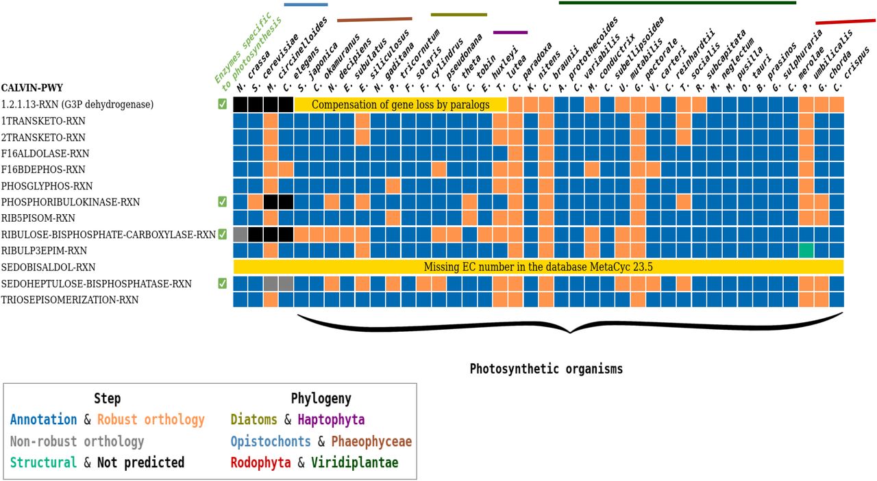AuCoMe results on the Calvin cycle pathway in the algal data set. AuCoMe was applied to the data set of 36 algae and four outgroup species (columns). Each row represents a MetaCyc reaction of the pathway; the table shows whether it is predicted by AuCoMe: blue, draft reconstruction; orange, robust reactions predicted by orthology propagation that passed the filter; green, structural verification; gray, nonrobust reactions predicted by orthology propagation and removed by the filter; black, not predicted; and yellow, manually added because the MetaCyc database 23.5 does not contain a reference gene–reaction association for this reaction.