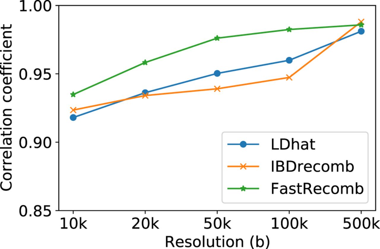 Pearson correlation coefficients between the inferred recombination rates and the ground truth.