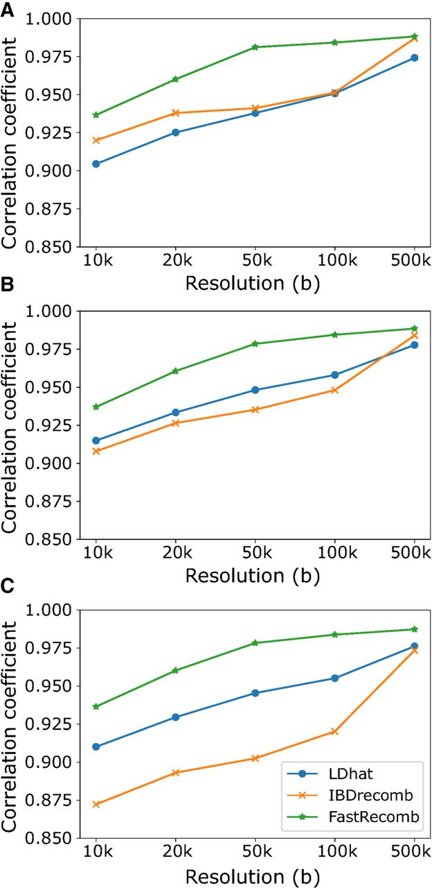 Pearson correlation coefficients in panels containing different error rates; 0.05% (A), 0.1% (B), and 0.2% (C).