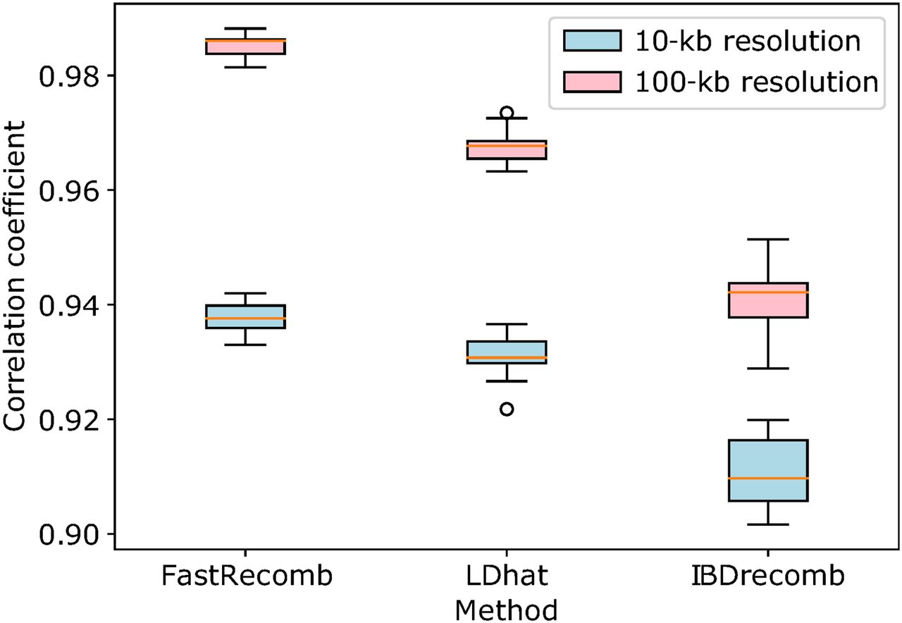 Performance of recombination rate estimation tools at 10-kb and 100-kb resolution using 10 different panels with a genotyping error rate of 0.1%.