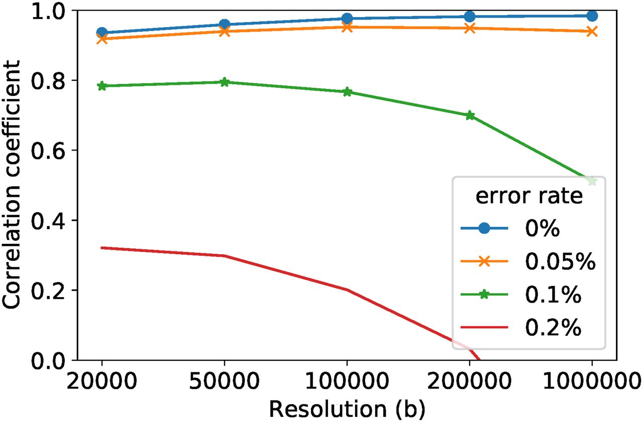 Pearson correlation coefficients of FastRecomb without smoothing the haplotype panel using different error rates.