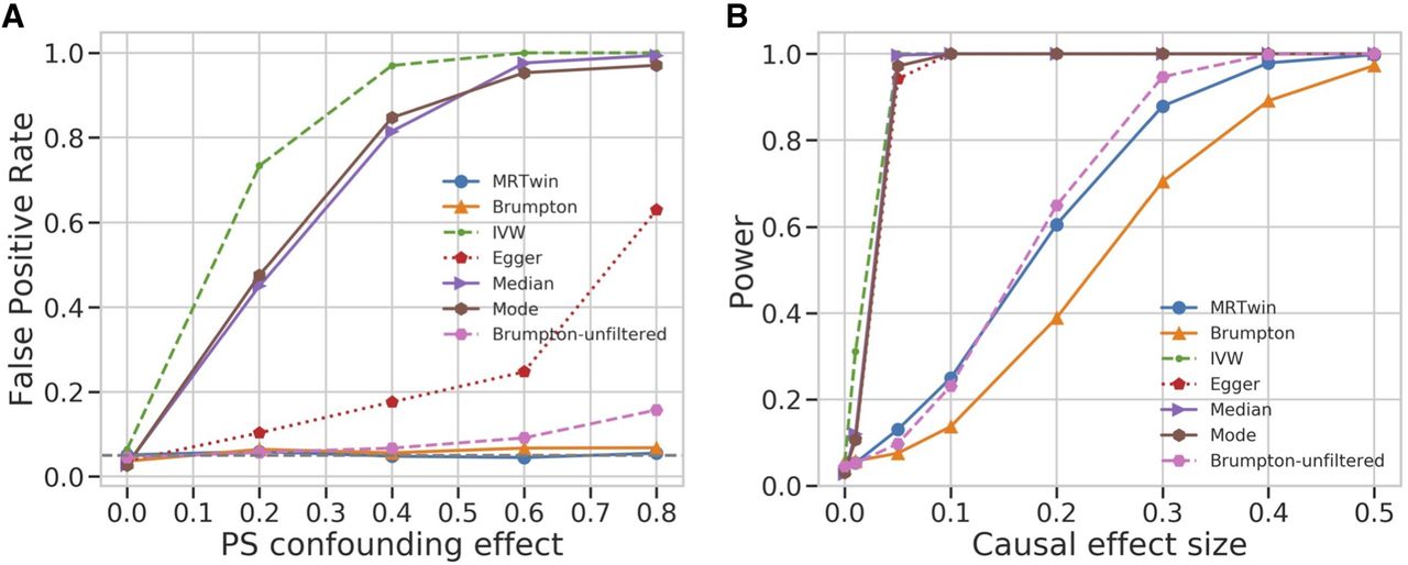 False-positive rate (FPR) and power comparison between various methods run on simulated data. (A) FPR (y-axis) under varying levels of confounding owing to population stratification (PS), with the x-axis describing the magnitude of the confounding effect of population labels on the exposure and outcome trait. (B) Power (y-axis) as a function of the magnitude of the causal effect of the exposure on the outcome trait (x-axis) in a setting with no confounding. Results are averaged over 1000 simulation replicates.