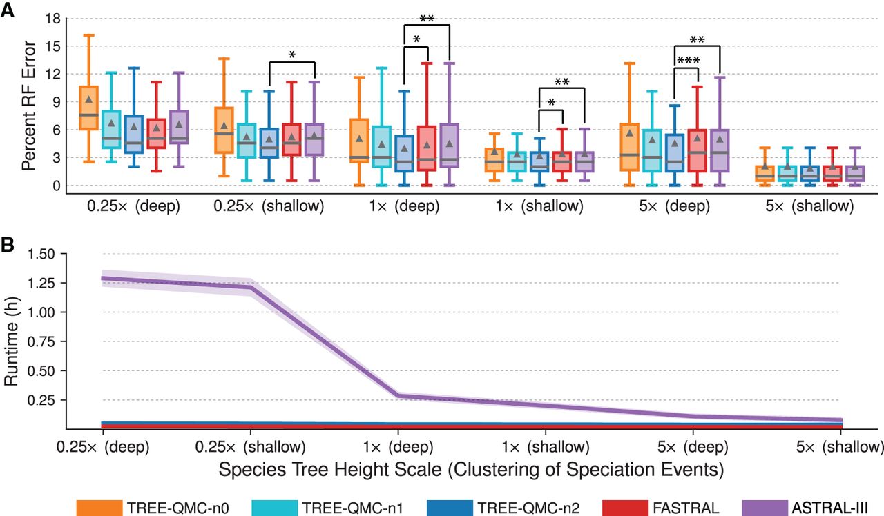Impact of the amount of ILS. (A) Percent species tree error across replicates (bars represent medians; triangles represent means; outliers are not shown). The symbols *, **, and *** indicate significance at P < 0.05, 0.005, and 0.0005, respectively (three tests survive multiple comparison corrections; see Supplemental Table S5 for details). (B) Mean runtime across replicates (shaded region indicates standard error). All data sets have 200 taxa and 1000 estimated gene trees. One model condition with species tree height 1× and shallow speciation is repeated from Fig. 2. For species tree heights 0.5×, 1×, and 5×, the ILS level is 68%–69%, 34%, and 9%–21%, respectively, and the GTEE level is 44%, 27%–34%, and 21%–28%, respectively.
