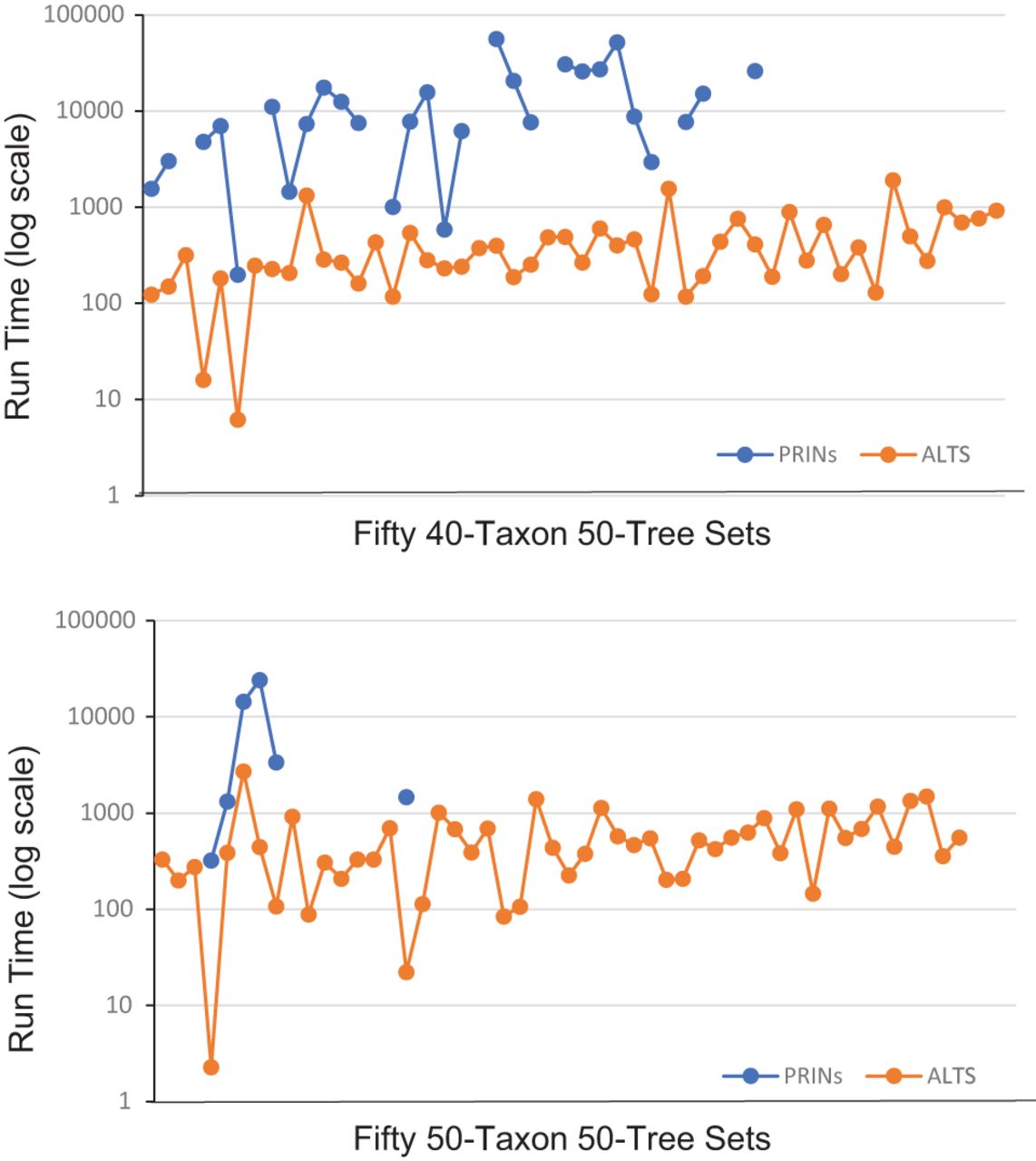 The run time (in seconds) of ALTS and PRINs on 100 data sets. Each data set contains 50 trees on 40 or 50 taxa. The data sets are sorted in the increasing order according to the HN of the tree–child networks inferred by ALTS. PRINs had some missing data points because of an abort after 24 h of clock time.