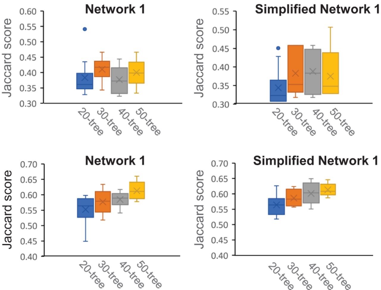 The box and whisker plots for the Jaccard scores for the original networks (Supplemental Figs. S1, S2) and ones inferred by ALTS in four cases. In each plot, the four bars from left to right summarize the Jaccard scores for the original network and 10 networks inferred from 20-, 30-, 40-, and 50-tree sets, respectively.