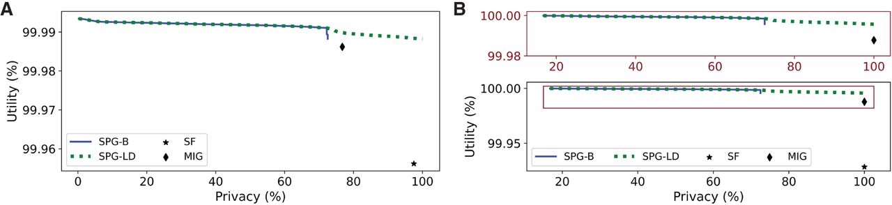 Fixed threshold attack model, in which the attacker leverages correlation data, and baselines only flip SNVs. (A) θ = 1000, baselines only flip SNVs. (B) θ = −250, baselines only mask SNVs.