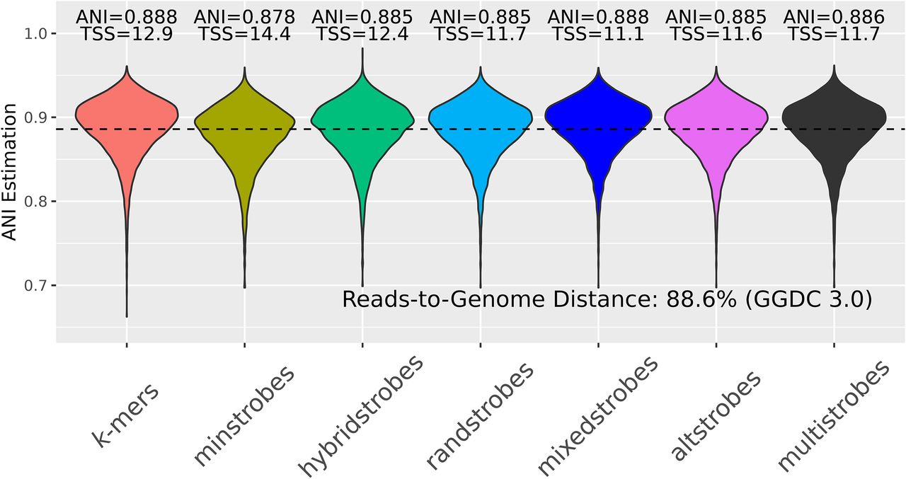 ANI estimation as estimated by Adjusted Mash distance (Methods) between E. coli ONT reads and a E. coli genome (assembly GCA 003018575.1 ASM301857v1) with k-mers, spaced k-mers, minstrobes, hybridstrobes, randstrobes (2,15,25,50), mixedstrobes (2,15,25,50,0.8), altstrobes (2,10,20,25,50), and multistrobes (2,5,25,25,50). For each method, the square of the Pearson correlation coefficient (R2, lower is better) and the TSS (lower is better) between ANI estimation and true mutation rate is given. The ANI was compared to the reads-to-genome distance (88.6%) obtained from GGDC 3.0 with default settings (Meier-Kolthoff et al. 2013, 2022) using the TSS.