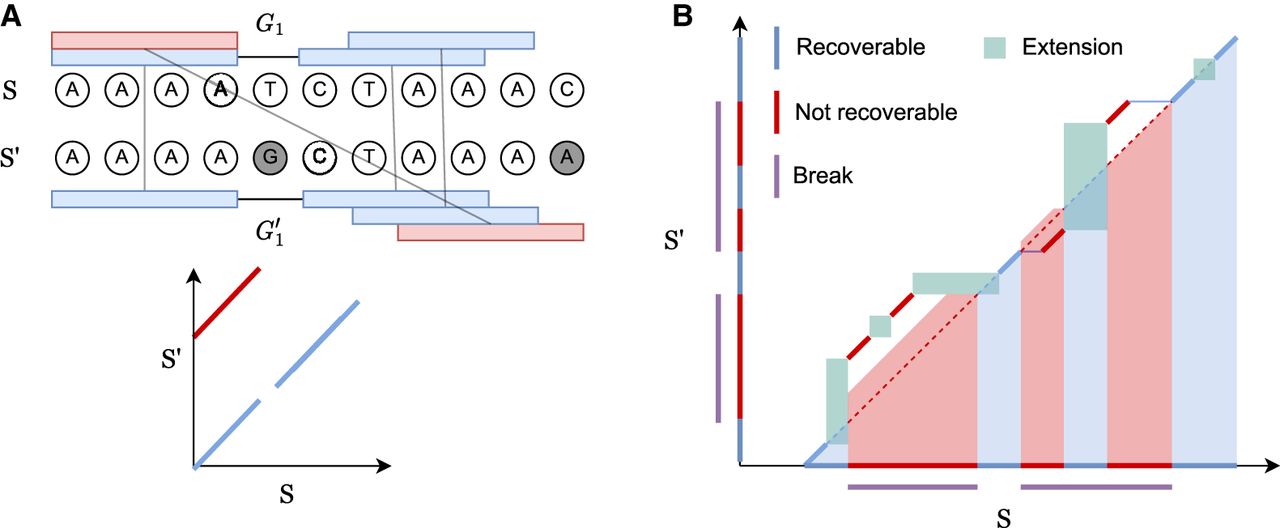 consists of anchors and DP matrices. Recoverable bases correspond to the bases on the homologous diagonal where a k-mer lies or is accessible by the green DP matrix between gaps. Breaks cover nonrecoverable sections.