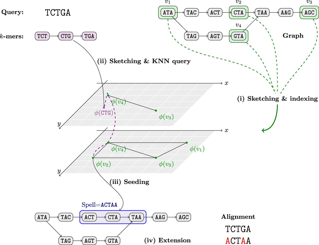 Illustrating the four main stages of MG-Sketch for a sequence graph with k = 3 node lengths. (i) Preprocessing involves sampling a subset of nodes (highlighted in green) to ensure that every walk of length 3 contains at least one sampled node. Each sampled node is sketched using ϕ:Σk → R2, which approximates the edit distance. The sketches are stored in a hierarchical structure with multiple levels, and connections between nodes are navigated to refine nearest neighbor queries. (ii) Sketch every k-mer in the query (magenta) and find the nearest neighbors stored in the index. (iii) Seed an alignment at the node returned in the previous step. (iv) Extend forward and backward from each seed, finding the path in the graph that maximizes the alignment score of the query.