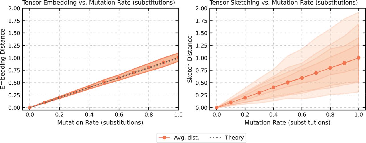 Comparison of expected distances for tensor embedding (left) and tensor sketching (right) as a function of the substitution mutation rate, for sequences of length n = 1000. Each data point is computed using 100 independent sequence pairs, and the process is repeated 100 times to compute the mean shown as the solid trace and the confidence interval shown as the shaded region, which covers the 5% − 95% range of the results. (Left) The solid trace shows the mean tensor embedding distance with t = 3, and the dashed trace shows the theoretical lower bound from Lemma 1. (Right) The solid trace shows the mean tensor sketch distance with t = 3 and D = 8, 16, 32, 64. The shaded regions correspond to increasing values of D, with the lightest shade corresponding to D = 8 and the darkest to D = 64.