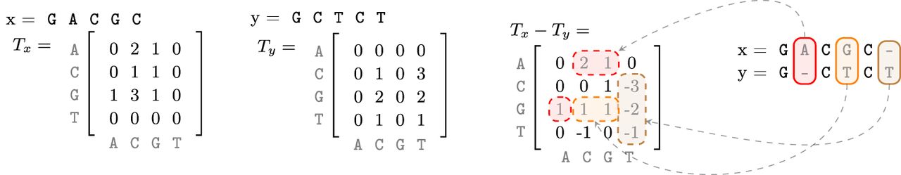 Tensor embedding illustration for t = 2. Observe that the substitution, insertion, and deletion correspond to blocks of nonzero elements in the difference tensor.