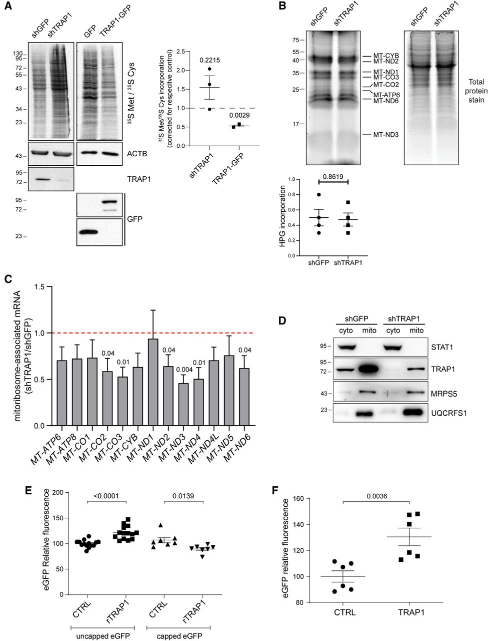 TRAP1 expression has opposite effects on total cell versus mitochondrial mRNA translation. (A) Representative autoradiography of total lysates from cells labeled with 35S Met/35S Cys, following tetracycline-induced induction of TRAP1-directed shRNA and control shRNA (72-h) cells or of TRAP1–GFP and unfused control GFP (24-h) cells, with relative densitometric band intensities and analysis (right). The P-values in the graph indicate the statistical significance based on the Student's t-test (n = 3). (B) Mito-FUNCAT-gel. Expression of GFP (control)-directed and TRAP1-directed shRNAs was induced in HeLa cells with tetracycline 72 h before labeling with 100 µM HPG-alkyne for 2 h. The resulting lysates were subjected to a click reaction with a TAMRA-azide, loaded for SDS-PAGE, and detected at 550 nm. (C) RT-qPCR performed on RNAs extracted from mitoribosomal fractions (4–11) isolated from HeLa cells 72 h after induction of shGFP/shTRAP1. The amount of mitoribosome-associated mRNA in the two samples has been normalized on 12S rRNA and corrected for its total expression level. Data are expressed as mean ±SEM (n = 5). Numbers above bars represent the statistical significance (P-value) based on the one-sample t-test. (D) Subcellular fractionation of HeLa cells showing the presence of indicated proteins into cytosolic (cyto) and mitochondrial (mito) fractions. (E) eGFP in vitro translation using wheat germ extracts. eGFP mRNA was added to reactions at a final concentration of 21.95 ng/μL. Where indicated, 0.3 μg/μL of TRAP1 recombinant protein (rTRAP1) was added to the reaction. Data are expressed as mean ± SEM (n = 14 for the translation of uncapped eGFP mRNA; n = 7 for the translation of capped eGFP mRNA). The two-tailed P-value represents the statistical significance based on the Student's t-test. (F) eGFP in vitro translation using E. coli extracts. eGFP mRNA was added to reactions at a final concentration of 21.95 ng/μL. Where indicated, 0.2 μg/uL of TRAP1 recombinant protein was added to the reaction. Data are expressed as mean ± SEM (n = 6). The P-value represents the statistical significance based on the Student's t-test.