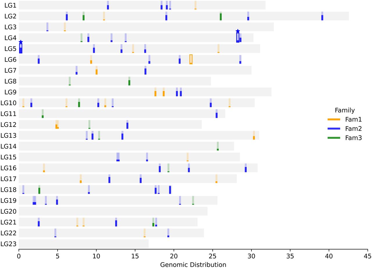Genomic distribution of DNMs in three guppy families for each chromosomal linkage group (LG). The height of each bar represents the number of offspring sharing the same DNM in the family. DNMs with an outline represent those in coding regions. Stars (★) indicate nonsynonymous mutations. No chromosome shows significant deviation from the expected number of DNMs based on its proportion of callable sites (χ2 test, see details in Supplemental Table S6). Fam1 (orange), Fam2 (blue), and Fam3 (green).