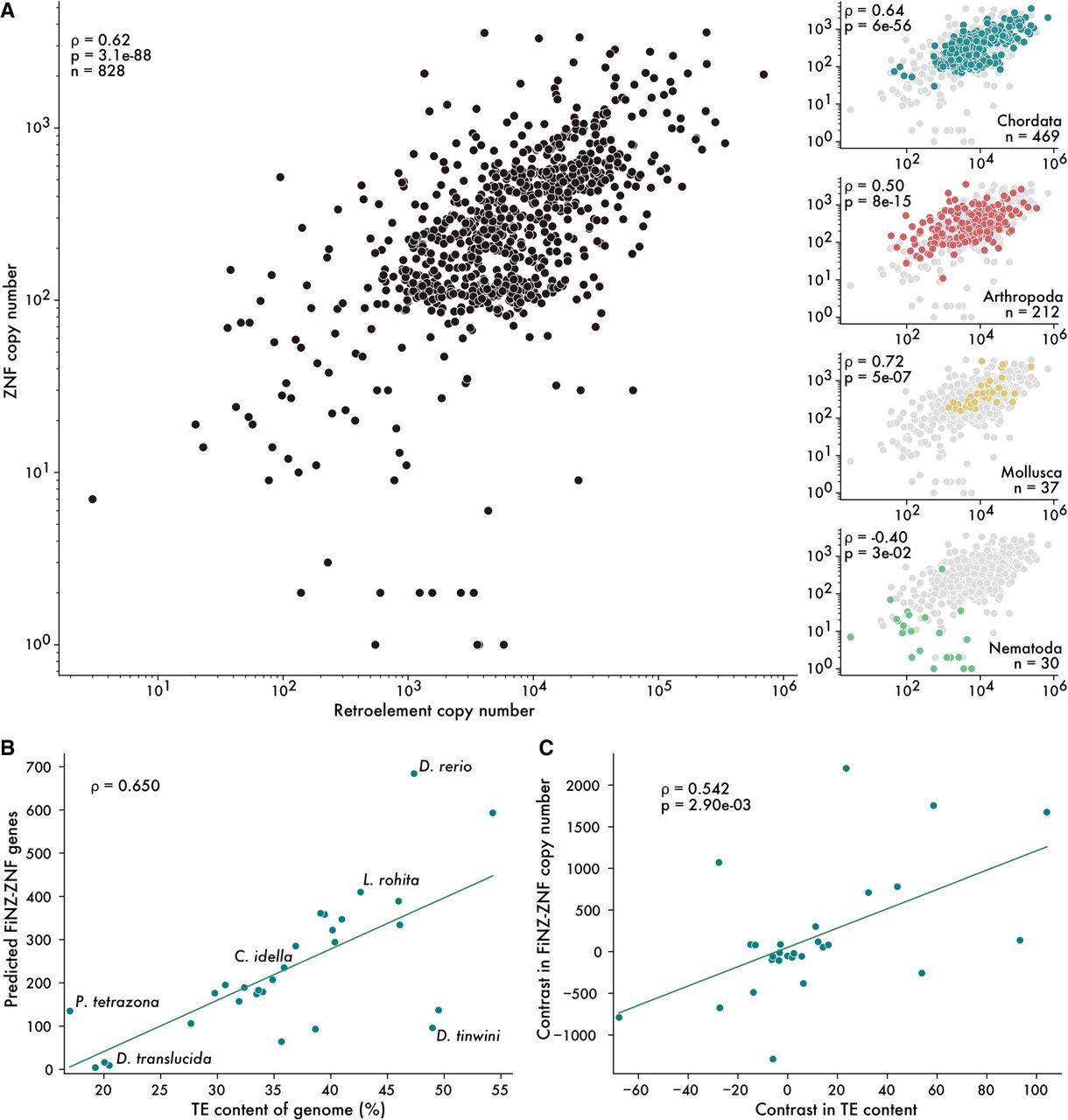 ZNF copy number correlates with genomic TE content. (A) Spearman's rank correlations between the estimated number of retroelement insertions and ZNF ORFs. Each point is a representative species from a taxonomic family. Subplots on the right show correlations for individual phyla. (B) Uncorrected Spearman's rank correlation between TE content and FZNF copy number in cyprinid fish. (C) Spearman's rank correlation on phylogenetically independent contrasts.