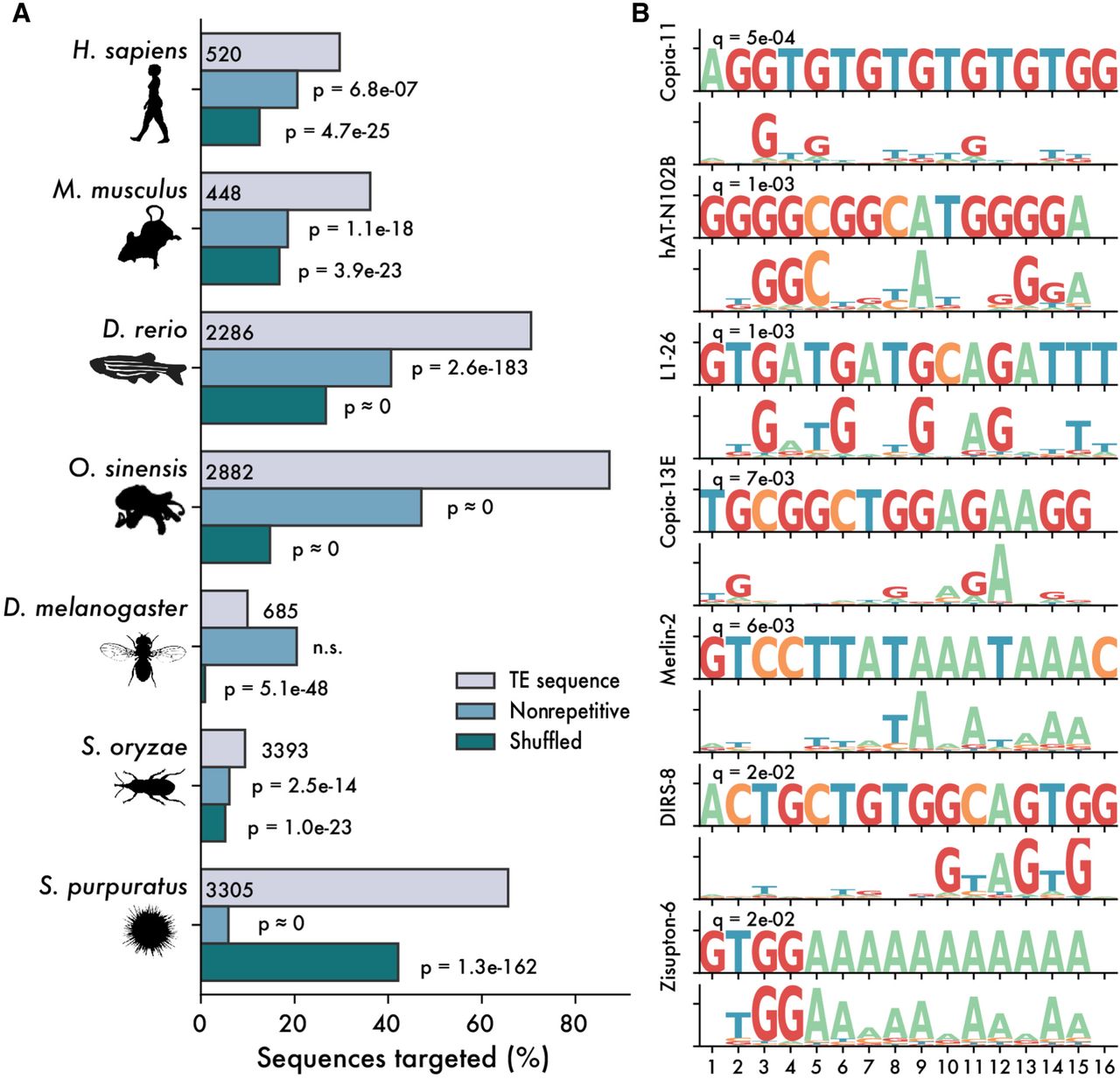 ZNFs are predicted to bind TE sequences. (A) Percentage of sequences matched by predicted ZNF motifs, with a Q-value cutoff of 0.05. Gray bars represent matches to libraries of consensus TE sequences, and blue bars represent matches in equally sized libraries of nonrepetitive genomic sequence. Green bars represent shuffled motifs, searched against consensus TE libraries. P-values are calculated as one-tailed binomial tests for the probability of observing at least x matches in the TE library, using binding frequency to nonrepetitive sequences or with shuffled motifs as a base probability. (B) Selected matches between Danio rerio consensus TE sequences and ZNF ORFs.