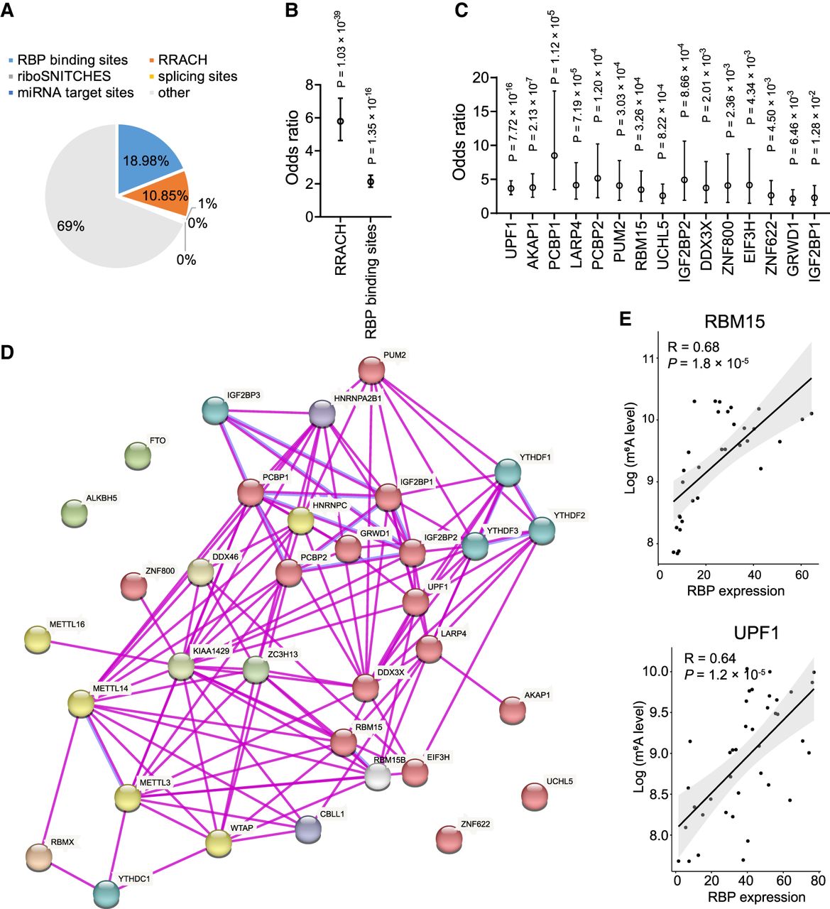 Prediction of trans-factors involved in ASm6A regulation. (A) Proportion of the putative functional variants for ASm6As that overlap with RNA-related features, including RBP binding sites, RRACH sequence, miRNA target sites, riboSNITCHES variants, and splicing sites. (B) Enrichment of the putative functional variants for ASm6As versus random control variants in RRACH sequence and RBP binding sites by Fisher's exact test. (C) Enrichment of the putative functional variants for ASm6As in binding sites of different RBPs by Fisher's exact test. (D) Protein–protein interactions between the RBPs in C and known m6A writers, readers, and erasers. The red sphere indicates the RBPs in C. (E) Correlation between RBP expression and aggregative m6A level of its targets for RBM15 (top) and UPF1 (bottom).