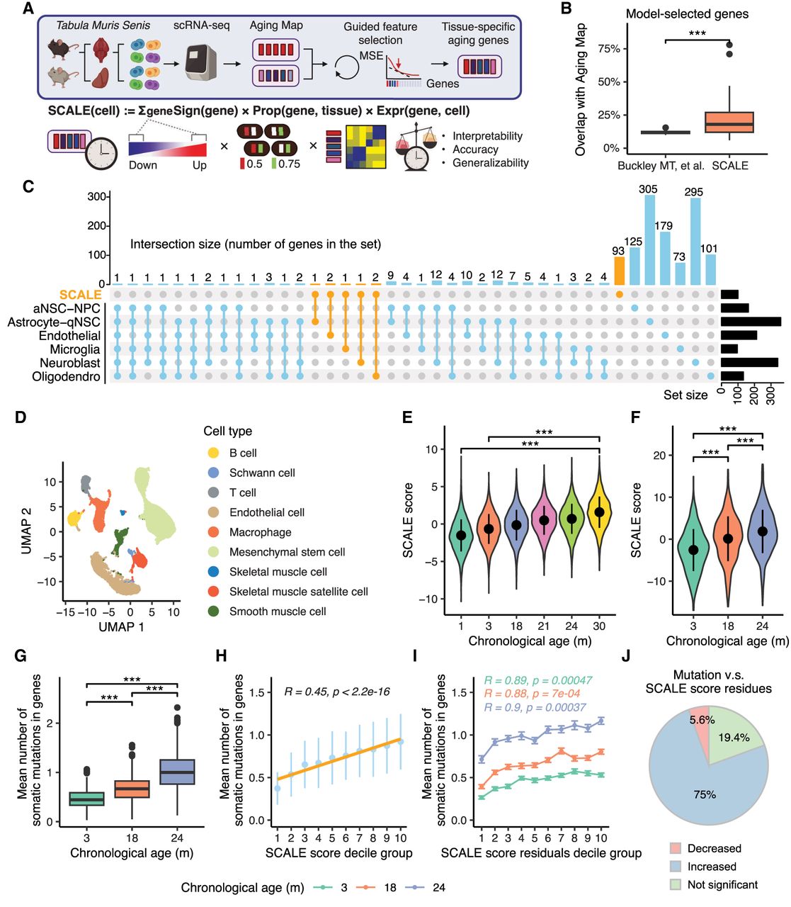 Tissue-specific quantification of aging in single-cell transcriptomic data using knowledge-guided feature selection. (A) Illustration of the SCALE pipeline applied to the Tabula Muris Senis data. (B) Boxplot showing overlaps between genes in Aging Map and aging genes selected by two methods, namely, aging clocks of Buckley et al. (2023) and SCALE. Each data point represents the gene set selected for a particular cell type (Buckley et al. 2023) or tissue (SCALE). (***) P-value < 0.001 using a two-sided unpaired Student's t-test. (C) UpSet plot illustrating the intersection of gene sets used by the six cell type–specific chronological aging clocks of Buckley et al. (2023) and the SCALE brain model. Genes selected by SCALE are highlighted in orange. (D) Uniform manifold approximation and projection (UMAP) plot of all cells in the kidney. Different colors show different cell types. (E) SCALE scores of kidney cells in each age group. Data are presented as the mean ± SD. (***) P-value < 0.001 using a two-sided unpaired Student's t-test. (F) SCALE scores of limb muscle cells in each age group. Data are presented as the mean ± SD. (***) P-value < 0.001 using a two-sided unpaired Student's t-test. (G) Boxplot showing the mutation burden (inferred from full-length scRNA-seq data) of limb muscle cells in each age group. Data are presented as the mean ± SD. (***) P-value < 0.001 using a two-sided unpaired Student's t-test. (H) Relationship between the mean number of somatic mutations in genes and the SCALE score of limb muscle cells. Cells were divided into 10 groups based on their SCALE scores (from low to high) for better visualization. The yellow line shows the linear regression model results fitted to the data with the corresponding R and P-value. Data are presented as the mean ± SD. (I) Relationship between the mean number of somatic mutations in genes and the SCALE score residual (after regressing out chronological age) of limb muscle cells. Cells were divided into 10 groups based on their SCALE score residuals (from low to high) for better visualization. Data are presented as the mean ± SE. R and P-value were calculated by fitting linear regression model for each age group individually. (J) Pie chart showing multitissue, multi–age group correlation analysis results between the mean number of somatic mutations in genes and the SCALE score residual. “Decreased” represents that mutation number significantly decreases with the SCALE score residuals, “Increased” represents that mutation number significantly increases with the SCALE score residuals, and “Not significant” represents that mutation number is not significantly linearly correlated with the SCALE score residuals.