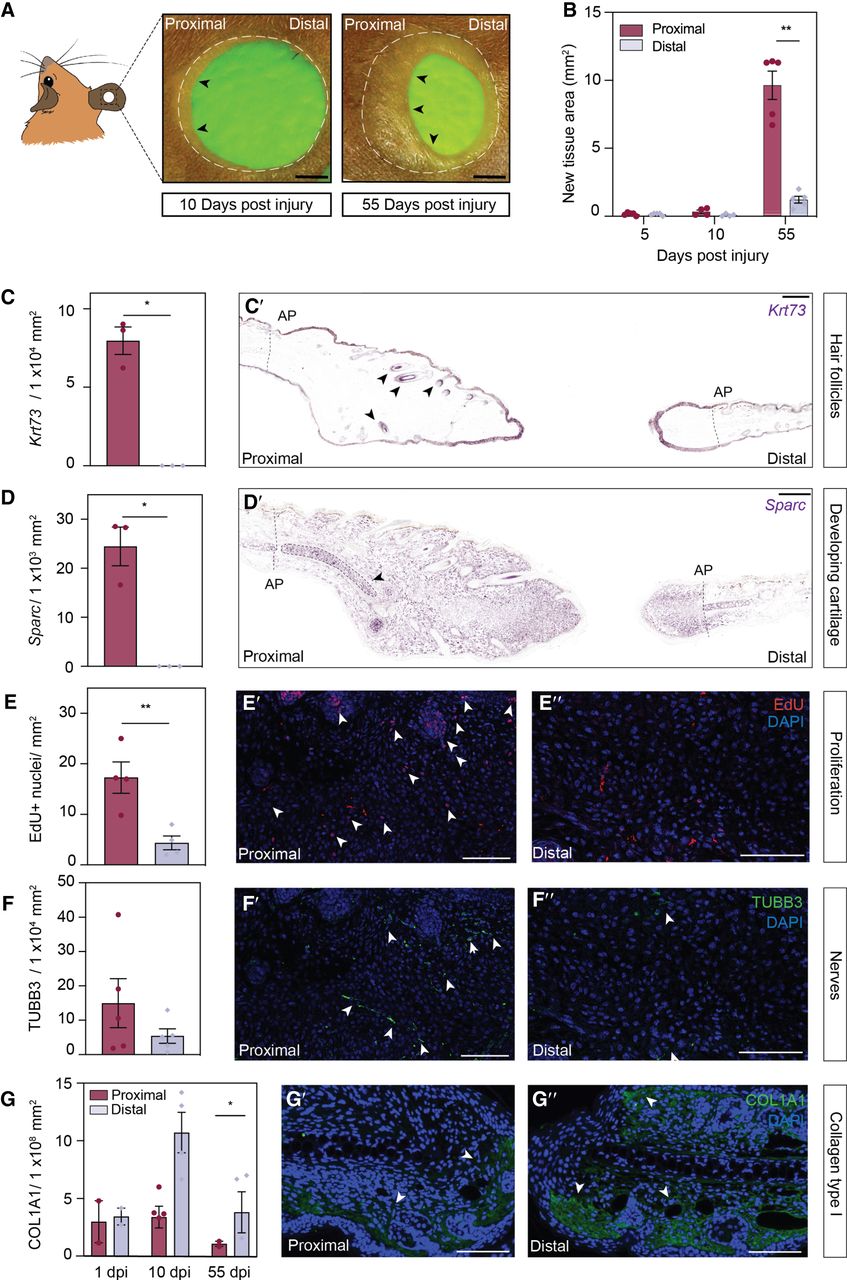 Quantification of asymmetric ear regeneration in Acomys. (A) Regeneration of a 4-mm ear punch. Images were taken at 10 and 55 d post injury (dpi). Dotted line: original amputation plane; arrows indicate newly formed tissue. Scale bar: 1 cm. (B) Quantification of new tissue area at proximal and distal wound sites at 5, 10, and 55 dpi. N = 5. (C,D) In situ hybridization on proximal and distal ear sections (55 dpi) against Krt73 (C′) and Sparc (D′) mRNA. Barplots represent numbers of Krt73+ hair follicles (n = 3) and Sparc+ cells in the newly formed cartilage, respectively. (E) 5-ethynyl-2′-deoxyuridine (EdU) staining of proximal (E′) and distal (E′′) ear sections. n = 4. (F) Nerve cell staining and quantification (positive area) of proximal (F′) and distal (F′′) ear sections with a TUBB3 antibody. n = 5. (G) Representative images and quantifications (positive area) of proximal (G′) and distal (G′′) ear sections stained with a COL1A1 antibody. 1 dpi n = 2, 10 dpi n = 4, 55 dpi n = 3. All barplots are represented as mean ± SEM, paired t-test. Scale bar: 100 μm. Asterisks indicate significance ([∗∗] P < 0.01; [∗] P < 0.05). Arrows indicate positive staining. (See also Supplemental Fig. S1.)