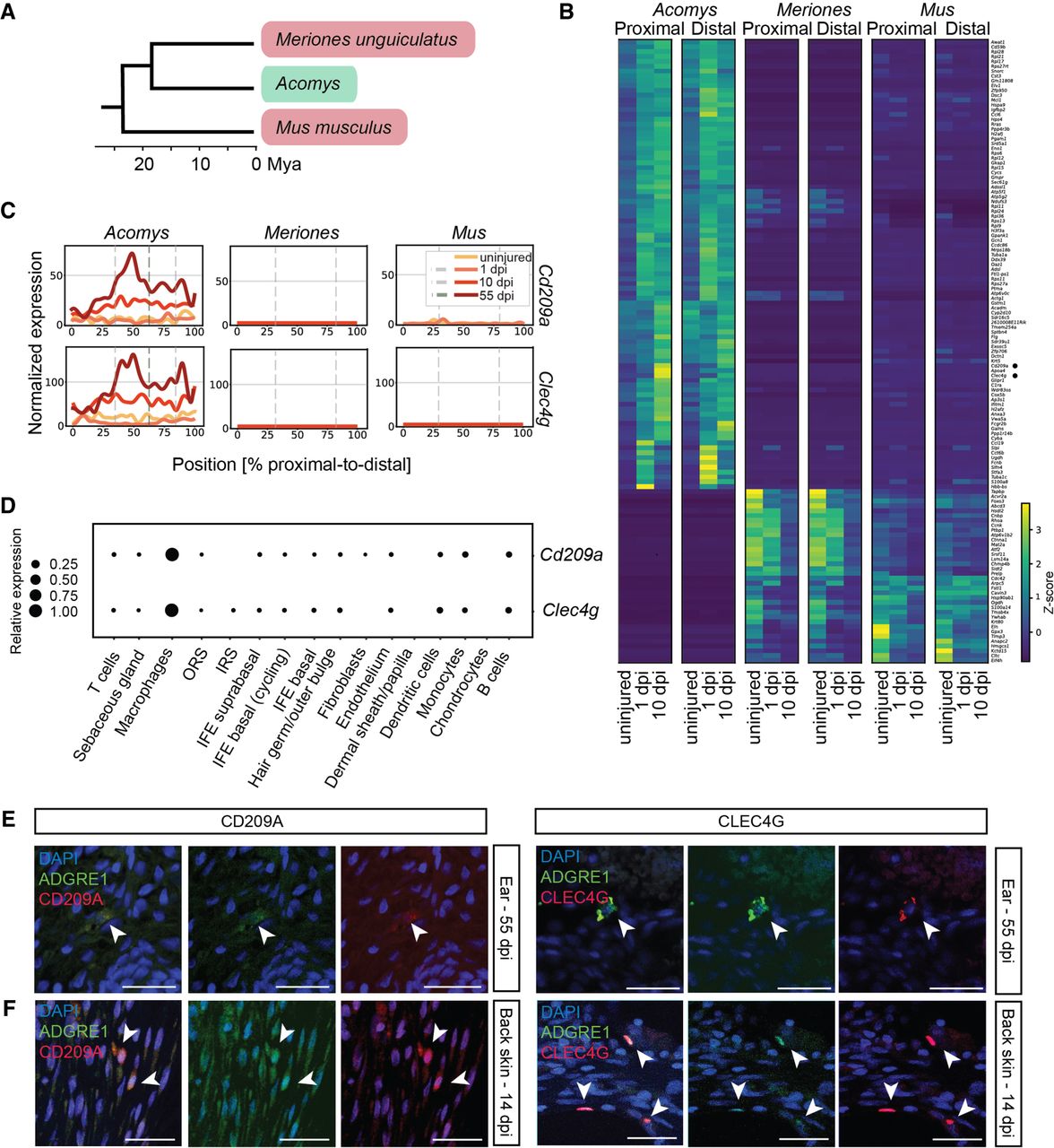Spatial comparison with the nonregenerating rodents Mus musculus and Meriones unguiculatus. (A) Phylogenetic tree showing relationships (in million years ago [mya]) between Acomys (“regenerator”), Meriones unguiculatus and Mus musculus (“nonregenerators”) (http://www.timetree.org). (B) Heat map containing two species specific clusters from the top 500 differentially expressed genes between the proximal/distal wound edge and the corresponding uninjured tissues, at 1 and 10 dpi, for Acomys, M. musculus, and M. unguiculatus. (C) Line plot with the normalized expression of Cd209a and Clec4g at the uninjured time point and at 1, 10, and 55 dpi in Acomys, M. unguiculatus, and M. musculus. (D) Dot plot visualization of gene expression of Cd209a and Clec4g in various cell types in single cell control data for Acomys. (E,F) Visualization of macrophages at the wound site of regenerating Acomys ear tissue (proximal side; 55 dpi) (E) or of regenerating Acomys back skin (14 dpi) (F) with an ADGRE1 antibody (green) and CLEC4G or CD209A (red) antibodies. Nuclei are blue (DAPI). Scale bar, 50 μm. (See Supplemental Fig. S8; Supplemental Tables S5, S6.)