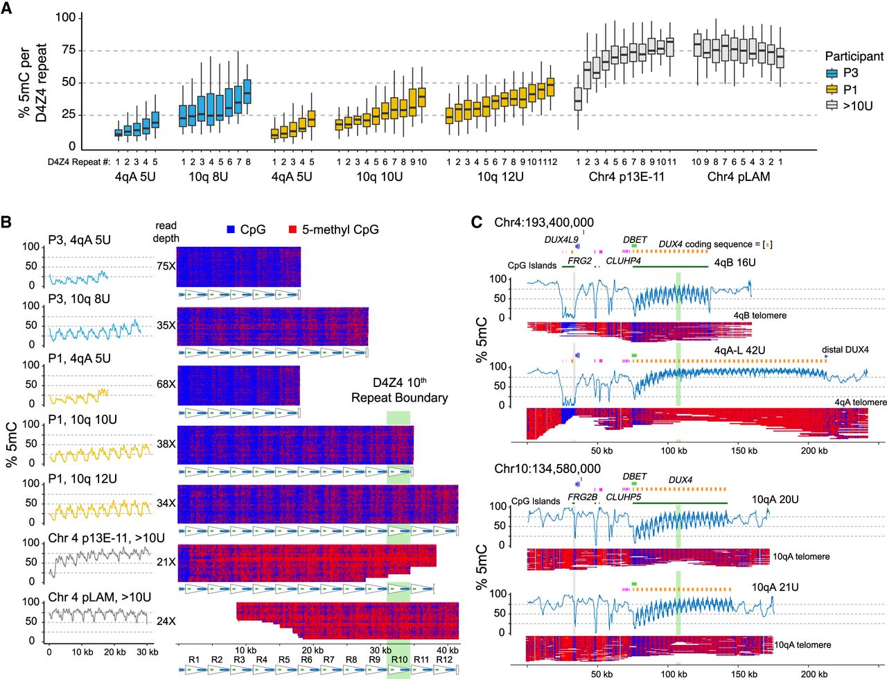 CpG methylation gradients traverse Chr 4q and 10q D4Z4 arrays. (A) Methylation levels of p13E-11 to pLAM targeted reads summarized as % 5mC sites per 3.3 kb KpnI-to-KpnI D4Z4 repeat. Repeat numbering starts at the centromeric end and is reversed for the pLAM (telomeric) reads. (B) Single-read modbamtools plots of reads from (A). The schematic D4Z4 repeats show the CTCF insulator (green) and DUX4 exons (blue), and a green stripe at the 10th centromeric D4Z4 repeat. (C) Alignments and methylation plots of untargeted reads (R10.4.1_e8.2 nanopores) from a control subject (C4) mapped to a 4qB 16U haplotype, 4qA 42U haplotype, 10q 20U haplotype, and 10q 21U haplotype. The gray stripe delineates the start of the syntenic telomeric region shared between 4q and 10q, and the green stripe marks the 10th D4Z4 repeat.