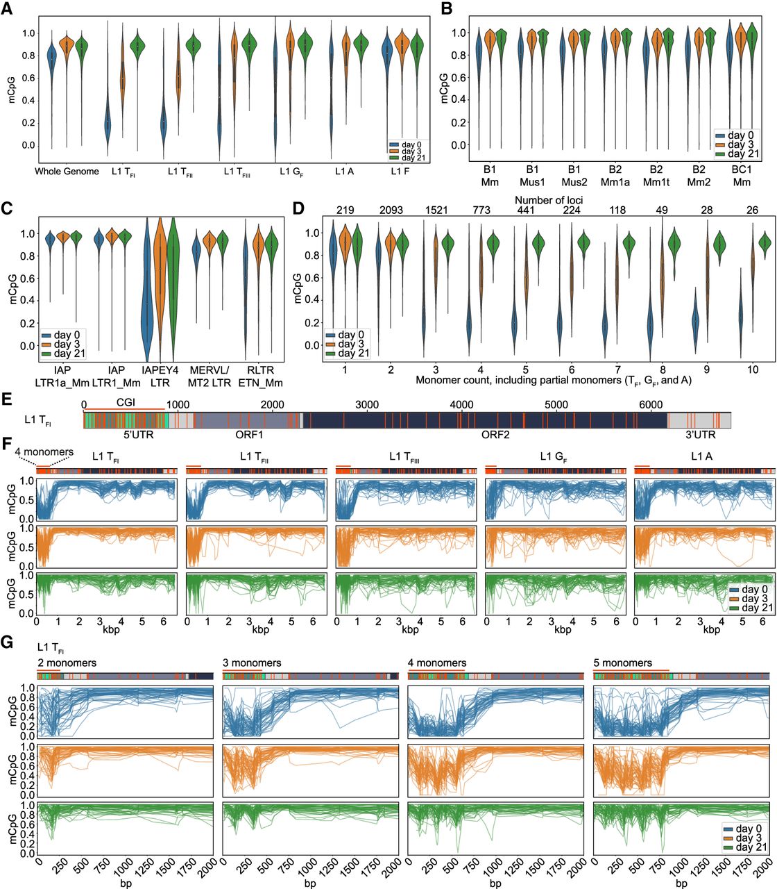 ONT CpG methylation profiles of TEs. (A) Violin plots are showing methylated CpG fraction for the whole genome (6 kbp windows), L1 5′ UTRs belonging to the active L1 TFI, TFII, TFIII, GF and A subfamilies and the evolutionary older and inactive L1 F subfamily at three time points of differentiation: d0 (undifferentiated mESCs in serum + LIF), d3 (EBs on day 3 of differentiation) and on d21 (completely differentiated cells). (B) As for (A), but for B1, B2 and BC1 SINE subfamilies. (C) As for (A), but for IAP LTR1a_Mm and LTR1_Mm, IAPEY4 LTR, MERV-L/MT2 LTR and RLTR ETn_Mm copies. (D) As for (A), but for violin plots showing the methylated CpG fraction of active L1 subfamily (TF, GF, and A together) promoters (monomers only) depending on the number of monomers (including partial monomers). Only elements with a minimum coverage of five reads across the whole 5′ UTR were included in the plot. The number of loci represented in each bin is shown in the top. (E) Annotated full-length L1 TF1 consensus showing the monomer units in green, unique region in light gray, ORF1 in dark gray, ORF2 in dark green, and 3′ UTR in light gray. CpG dinucleotides throughout the whole element are displayed as orange strokes. The promoter CpG island (CGI) is indicated as an orange line. Number of bp are shown above the element. (F) Data is shown for full-length L1s (TFI, TFII, TFIII, GF and A) containing four monomers in the promoter at three time points of differentiation: d0 (undifferentiated mESCs in serum + LIF), d3 (EBs on day 3 of differentiation), and on d21 (completely differentiated cells). Each graph displays up to 50 methylation profiles for the specified L1 subfamily. Annotated consensus sequences as per (E) are shown at top including CpG positions. (G) As for (F), but for promoters of L1 TFI subfamily members containing between 2 and 5 monomers at three time points of differentiation (d0, d3, and d21).
