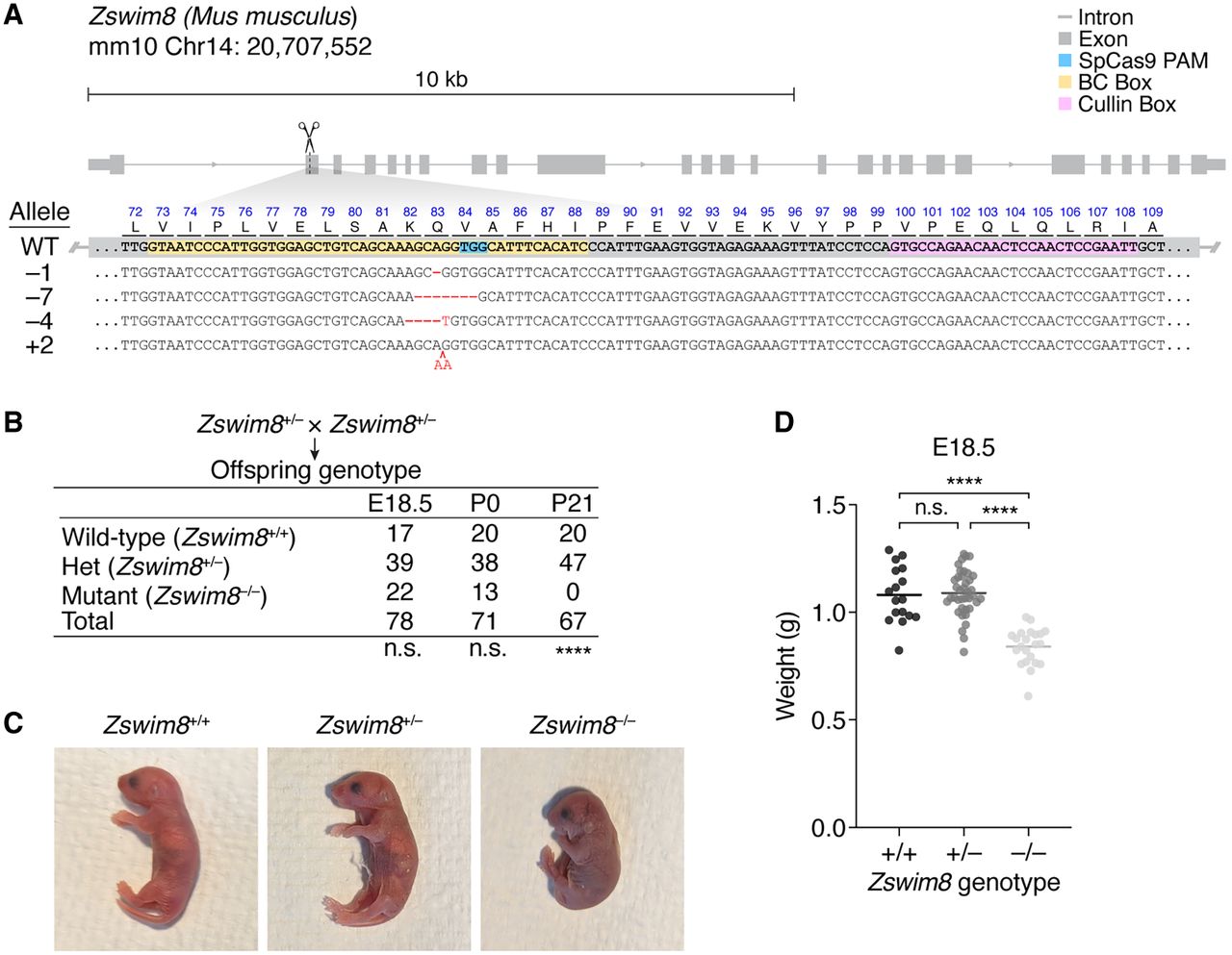 Gross phenotypes of Zswim8−/− mice. (A) Organization of the murine Zswim8 genomic locus. Shown below the gene model (thick gray boxes indicate the exonic coding sequence; thin gray boxes, exonic untranslated regions; gray lines, introns; blue box, Cas9 PAM; yellow box, annotated BC box motif; pink box, annotated Cullin box motif) are the genomic DNA sequences of the wild-type (WT) allele and four mutant alleles (“–1,” “–7,” “–4,” and “+2”), as well as the amino acid sequence of the expected WT translation product. Blue text indicates the WT protein sequence; black text, WT DNA sequence; red text, insertions; and red dashes, deletions. (B) Penetrant lethality of Zswim8−/− animals. Shown are genotypes of offspring produced from intercrosses between Zswim8+/− parents. Offspring were counted at either embryonic day (E)18.5, postnatal day (P) 0, or P21. Differences from the Mendelian expectation were evaluated using the chi-square test (two-tailed): (n.s.) not significant, P > 0.05; (****) P < 0.0001. (C) Cyanotic phenotype of Zswim8−/− pups. Shown are P0 neonate siblings with the indicated genotypes, cropped from the same photograph. (D) Smaller size of Zswim8−/− embryos. Plotted are weights of E18.5 embryos produced from intercrosses between Zswim8+/− parents. Horizontal lines indicate the mean. Significance of differences were evaluated using ANOVA (Tukey's multiple comparisons test): (n.s.) not significant, P > 0.05; (****) P < 0.0001.