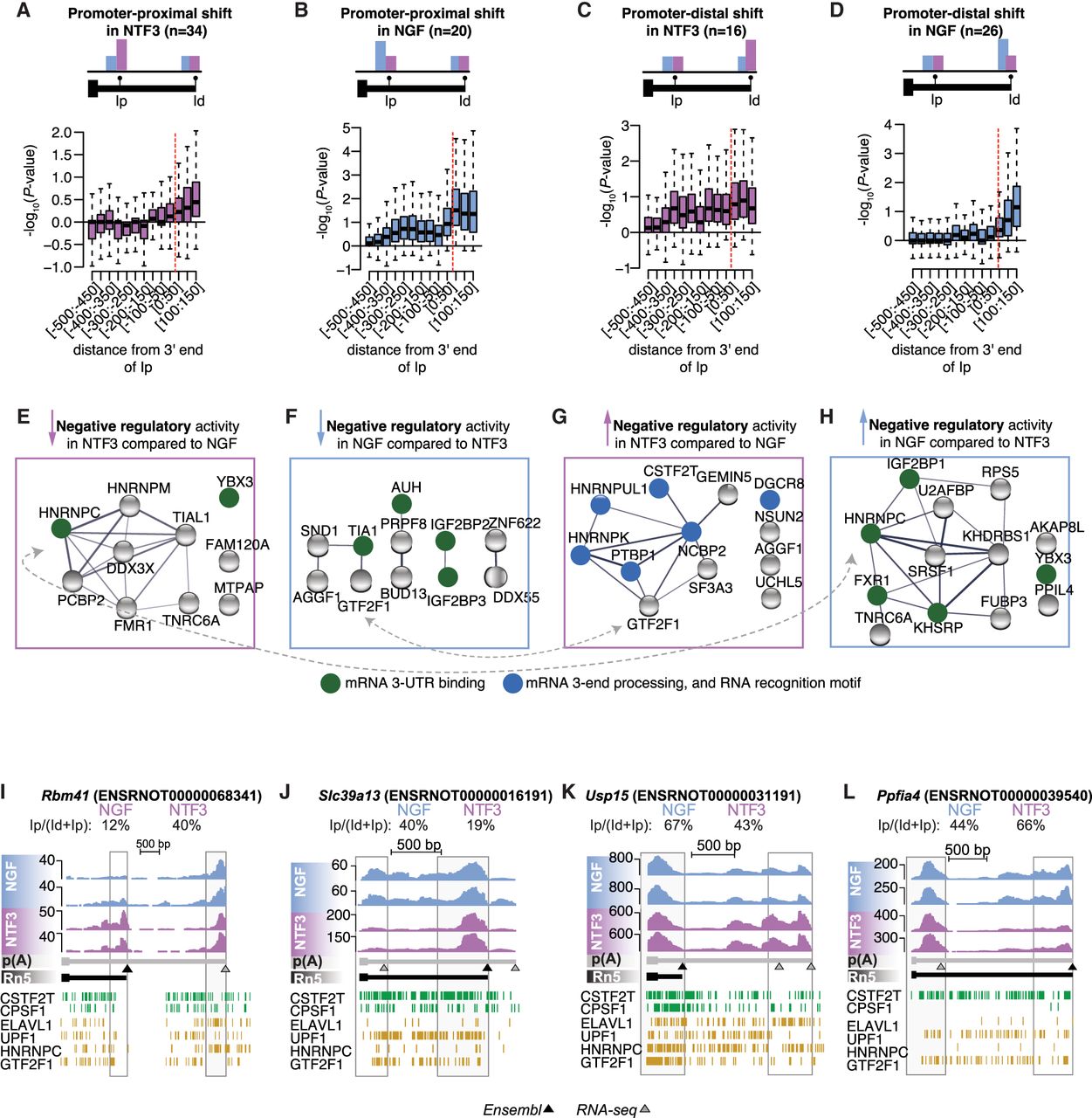 Reduction of negative regulatory activity is predicted to underlie neurotrophin-driven APA. (A–D) Distribution of Fisher's enrichment scores (−log10(P-value)) in cross-link events of 126 RBPs along the short 3′ UTR isoforms of the pairs of isoforms showing significant promoter-proximal shifts in NTF3 (A) or NGF (B) and promoter-distal shifts in NTF3 (C) or NGF (D). (E–H) Networks of protein–protein interactions for the RBPs showing significant enrichment in cross-link events in the [0:+150]-nt regions downstream from the 3′ end of the short 3′ UTR isoforms associated with significant promoter-proximal shifts in NTF3 (A) or NGF (B) and promoter-distal shifts in NTF3 (C) or NGF (D). Edges represent experimentally determined protein–protein interactions annotated in the STRING database. Nodes indicate proteins colored according to the biological pathways they are enriched in. Arrows indicate the predicted directions in changes in activity of the RBPs. (I–L) Genome browser views of 3′ end sequencing profiles and CLIP cross-linking events for predicted positive (green) and negative (gold) regulators of APA for 3′ UTR isoforms showing a marked shift toward increase in promoter-proximal 3′ UTR usage (Rbm41 and Slc39a13) or in promoter-distal 3′ UTR usage (Usp15 and Ppfia4) in either condition. Gray boxes highlight the location of promoter-proximal and promoter-distal 3′ UTR isoforms.