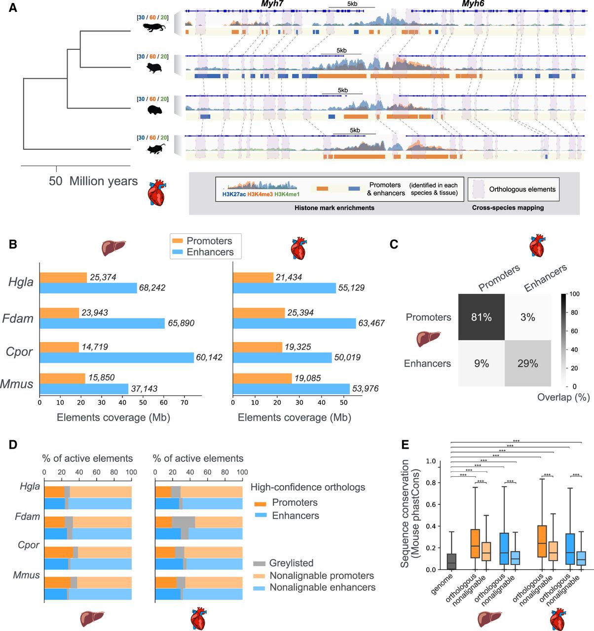 Comparative epigenomics of mole-rat promoters and enhancers in the heart and liver. (A) Epigenomic profiling and cross-mapping approach exemplified by the Myh6/Myh7 heart locus. H3K27ac (blue), H3K4me3 (orange), and H3K4me1 (green) histone mark enrichment in the heart are shown for each of the four species: (Hgla) naked-mole rat, (Fdam) Damaraland mole-rat, (Cpor) guinea pig, and (Mmus) mouse. Scales above species names indicate fold enrichment over input (averaged across replicates). Note that we use the same scale across species to facilitate direct visual comparison of histone mark enrichments. Identified promoters and enhancers are represented by orange and blue boxes, respectively. Purple boxes connected by dashed lines correspond to orthologous promoters and enhancers in each species. (B) Coverage and numbers of promoters and enhancers by species and tissue. Bars correspond to total genomic coverage; the number of elements are indicated at the right of bars. (C) Overlap between promoters and enhancers across the liver and heart tissues, averaged over the four species. Percentages represent the fraction of overlapping elements in each category. (D) Percentage of promoter and enhancer elements containing high-confidence orthologous regions across the four species (dark orange and blue bars). Lighter shade bars indicate promoters and enhancers with no high-confidence orthologs (nonalignable). Graylisted regulatory elements correspond to elements with elevated read density in input ChIP (Methods). (E). Sequence conservation of orthologous and nonalignable promoters and enhancers in the mouse. Orthologous mouse elements have significantly higher phastCons sequence conservation scores than those of nonalignable elements. Both orthologous and nonalignable mouse elements have sequences significantly more conserved than the genomic background: Mann–Whitney U tests, with Benjamini–Hochberg correction for multiple testing, (***) corrected P-values < 0.001. See also Supplemental Figures S1 and S2 and Supplemental Table S1.
