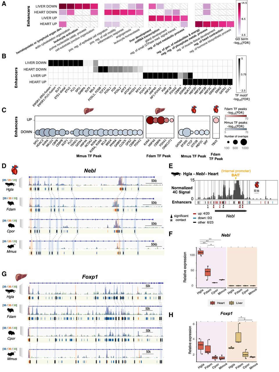 Gene Ontologies (GOs) and transcription factor binding sites enriched in enhancers with an activity shift on the ancestral mole-rat branch. (A) Top GO terms enriched in enhancers with an activity shift on the ancestral mole-rat branch. The top five associated GO terms (GREAT enrichment tests, corrected P-values < 0.05; Methods) are shown for each set. Colors indicate P-value significance levels (−log10 FDR) of the GO term in each set, and white barred boxes mark sets in which the term is not enriched (not in the top 100). The complete list of enriched terms is available in Supplemental Tables S4 through S6. (B) Transcription factor binding motifs enriched in mole-rat enhancers with an activity shift on the ancestral branch. Enriched motifs are represented as a heatmap, with color scale proportional to P-value significance levels (−log10 FDR) of the motif in enrichment tests (HOMER enrichment tests; Methods). The complete list of enriched TF motifs is available in Supplemental Table S7. (C) ChIP-seq transcription factor binding signals enriched in mole-rat enhancers with an activity shift on the ancestral branch. Circle plots show enrichments with size proportional to the number of overlapping peaks, and darker colors denote lower FDR significance. Enrichments are shown for either tissue and each tested transcription factor in mouse (Mmus) and Damaraland mole-rat (Fdam) ChIP-sequencing data sets. (D) Example of heart promoters and enhancers with an activity shift in mole rats and associated to the nebulette (Nebl) locus. Representation as in Figure 2D: H3K27ac (blue), H3K4me3 (orange), and H3K4me1 (green) histone marks enrichment in heart displayed around Nebl. Promoters are shown in orange; enhancers, in blue. Orthologous up enhancers and promoters are identified by black boxes and are linked by light blue or orange boxes (respectively) and dashed lines across species. (E) Chromatin interactions between the Nebl internal promoter (bait; orange arrow) and genomic elements in the same locus in naked mole-rat heart. Gray bars denote significant interactions (4C peaks; Methods), and asterisks denote significant contacts with a candidate enhancer (enhancers overlapping a 4C peak, bars in track below; red for “up,” blue for “down,” and black for “other”). (F) Relative Nebl mRNA expression across the heart and liver samples from the four species. (*) P < 0.05, (**) P < 0.001 (one-way ANOVA, Tukey post-hoc test). (G) Example of Up promoters and enhancers at the Foxp1 locus in liver. Representation as in D. (H) Relative Foxp1 mRNA expression. Representation as in F. See also Supplemental Tables S4 through S9 and Supplemental Figures S6 through S9.