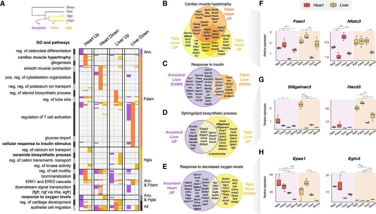 Comparison of GOs and pathways enriched in enhancers with an activity shift in ancestral and single-species mole-rat branches. (A) GO terms significantly associated to enhancers with activity shifts in mole rats across different branches (top left inset) and tissues. Similar GO terms and pathways were grouped in clusters (left axis; Methods). Each row in the heatmap is a GO term or pathway within a cluster, with its presence (colored) or absence (white) indicated in each enhancer set. Columns correspond to the different tissues and shift directions; colors, to the branches (top left inset). Clusters are ordered to highlight terms enriched in particular branches (right axis). The complete list of enriched terms and cluster membership is available in Supplemental Table S10. (B–E) Selected examples of GO terms enriched across enhancers of different branches or tissues. Venn diagrams show the overlap between genes associated with shifted enhancers of each set (Methods). (F–H) Relative gene expression levels for loci associated with cardiac hypertrophy (F), sphingolipid biosynthesis (G), and response to hypoxia (H). Representation as in Figure 3F. See also Supplemental Figures S7 and S9 and Supplemental Table S10.
