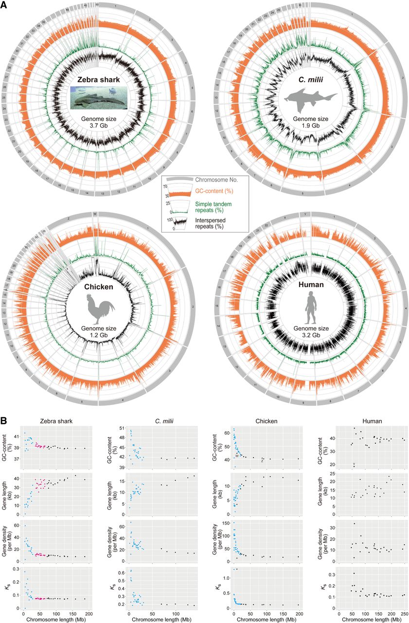 Chromosomal sequence compositions of the zebra shark and selected vertebrate species. (A) Sequence characterization of different chromosomal segments. The orange areas show GC content (30%–70%), whereas the green and black lines show content of simple tandem repeats (0%–25%) and interspersed repeats (0%–100%), respectively, in 100-kb-long nonoverlapping windows. (B) Two-dimensional plots of GC content and median values of gene length, gene density, and the median of synonymous substitutions per synonymous site (Ks) for protein-coding genes on individual chromosomes. See Methods for statistical tests for correlation of these features with chromosome length. Computation of Ks was performed for each of the four species in order by involving a pair species, namely, whale shark Rhincodon typus; small-eyed rabbitfish Hydrolagus affinis; helmeted guineafowl Numida meleagris; and common marmoset Callithrix jacchus. Zebra shark chromosomes are shown as three groups, eMAC, eMID, and eMIC (see text for details), in black, magenta, and cyan, respectively, whereas microchromosomes of the chicken and Callorhinchus milii are colored in cyan. At the moment, C. milii is the only holocephalan species with a chromosome-scale genome assembly.