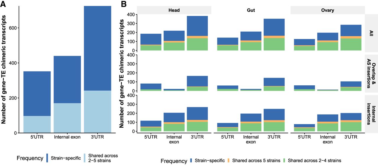 Position and frequency distribution of TEs in chimeric transcripts. (A) Number of gene–TE chimeric transcripts by position and frequency. (B) Number of chimeric gene–TE transcripts by insertion group and body part, according to the insertion position (5′/3′ UTRs or internal exons) and frequency. Each dot represents the number of chimeric gene–TE transcripts according to the frequency: strain-specific (blue), shared across two to four strains (green), and shared across all five strains (orange). These analyses were performed with the subset of chimeric transcripts with only one TE annotated (1634).