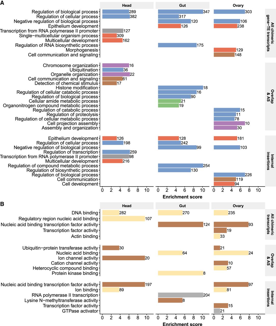 Biological processes and molecular functions of chimeric gene–TE transcripts. (A) Biological processes clustering. (B) Molecular functions clustering. The length of the bars represents the cluster enrichment score. The number in the bars represents the number of genes in each cluster. Names of the annotation clusters are manually processed based on the cluster's GO terms. Colors represent similar annotation clusters. Detailed GO terms of each cluster are given in Supplemental Table S8A,B.