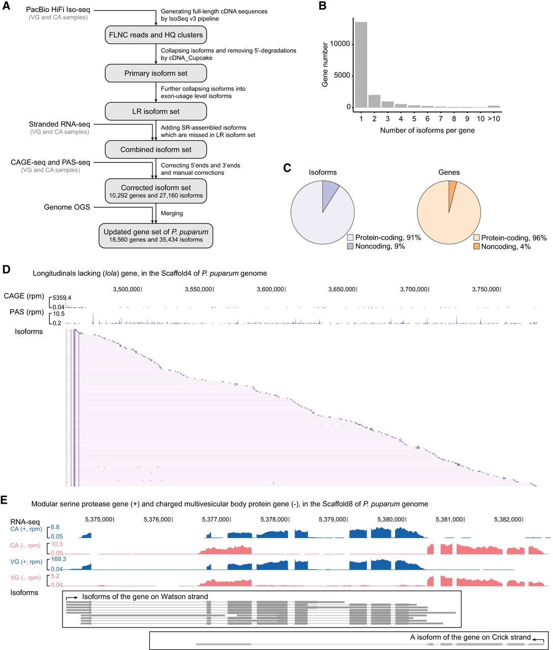 Overview of the high-resolution RNA isoform annotation in adult female P. puparum. (A) The workflow for sequencing and analysis, which includes multiple sequencing strategies such as PacBio HiFi Iso-Seq, stranded RNA-seq, CAGE-Seq, and PAS-Seq, as well as bioinformatic analyses for full-length transcriptome reconstruction and error corrections. (B) Distribution of the number of isoforms per gene. (C) Pie charts illustrating the composition of coding and noncoding isoforms/genes. (D) An example gene (longitudinals lacking gene, lola) with 266 isoforms. The top panel shows CAGE reads, the middle panel shows PAS reads, and the bottom panel shows a subset of isoforms (for complete set, refer to Supplemental Fig. S4). (rpm) reads per million. (E) An example demonstrating the precise annotation of two overlapping genes from different strands. The top panel shows strand-specific RNA-seq (blue represents Watson strand mapping reads; red represents Crick strand mapping reads), and the bottom panel shows isoforms. (VG) venom gland, (CA) carcass, (rpm) reads per million.