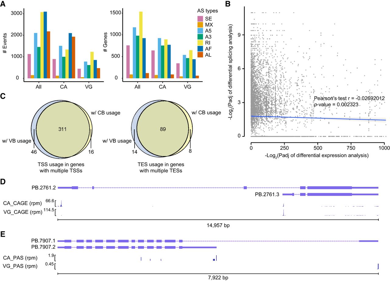 Differential alternative RNA processing events between the venom gland and carcass. (A) Statistical analysis of alternative splicing (AS) events and AS genes in three gene sets: all genes (All), genes expressed in the venom gland (VG), and genes expressed in the carcass (CA). Expressed genes were defined as those with TPM values higher than 1 in at least one replicate of the corresponding sample. The chart displays seven types of AS events: skipping exon (SE), mutually exclusive exons (MX), alternative 5′/3′ splice sites (A5/A3), retained intron (RI), and alternative first/last exons (AF/AL). (B) Scatter plot illustrating the relationship between differentially spliced genes (DSG) and differentially expressed genes (DEG). Pearson correlation analysis revealed no significant association between the DSGs and DEGs. The lines represent linear regressions, and the shaded areas depict 95% confidence intervals around the mean predictions. (C) Alternative usage of transcription start sites (TSS) in genes with multiple TSSs and alternative usage of transcription end site (TES) in genes with multiple TESs. We identified 311 genes with at least one venom gland-biased TSS and one carcass-biased TSS, as well as 89 genes with at least one venom gland-biased TES and one carcass-biased TES. (D) An example of a gene exhibiting distinct TSS usage between the venom gland and carcass, resulting in two different isoforms. The panels show isoforms, CAGE-Seq in the carcass, and CAGE-Seq in the venom gland. (E) An example of a gene with distinct TES usage between the venom gland and carcass. The panels display isoforms, PAS-Seq in the carcass, and PAS-Seq in the venom gland. (rpm) reads per million.