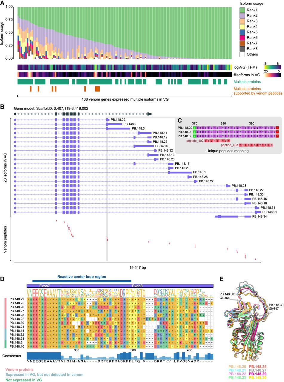 Diverse isoforms of venom genes in P. puparum. (A) Isoform usage of venom genes. Only isoforms expressed in the venom gland are included, and isoforms with TPM values higher than 1 in at least one replicate of the venom gland sample are considered expressed. The usages of isoforms within each gene are ranked (Rank1 represents the most used isoform in a gene) and depicted in different colors. Venom genes with multiple isoforms encoding different proteins are indicated, with emphasis on genes supported by mass spectrometry-based proteomics. This figure showcases venom genes that express multiple isoforms in the venom gland. Please refer to Supplemental Figure S5 for the isoform usage landscape of all venom genes. (B) PpSerpin1 exhibits the expression of 23 isoforms in the venom gland, encoding a total of 12 proteins, with eight of them supported by venom proteome evidence. (C) A zoomed view of the alignments between a protein encoded by isoforms (PB.148.3/.9/.29) and venom peptides. Additional supporting evidence for seven other venom serpin1 proteins can be found in Supplemental Figures S16 and S17. (D) Local alignment of amino acid sequences encoded by PpSerpin1 isoforms starting with Valine343. The putative reactive center loop region is indicated. Isoform PB.148.34 is not included in the alignment because of the absence of the serpin domain. (E) Comparison of 3D protein models predicted using AlphaFold2, highlighting variations in the reactive center loop among the eight venom serpin protein isoforms produced by PpSerpin1 through alternative splicing. The highlighted residues in the PB.148.30 protein structure represent the predicted start and end of the reactive center loop.